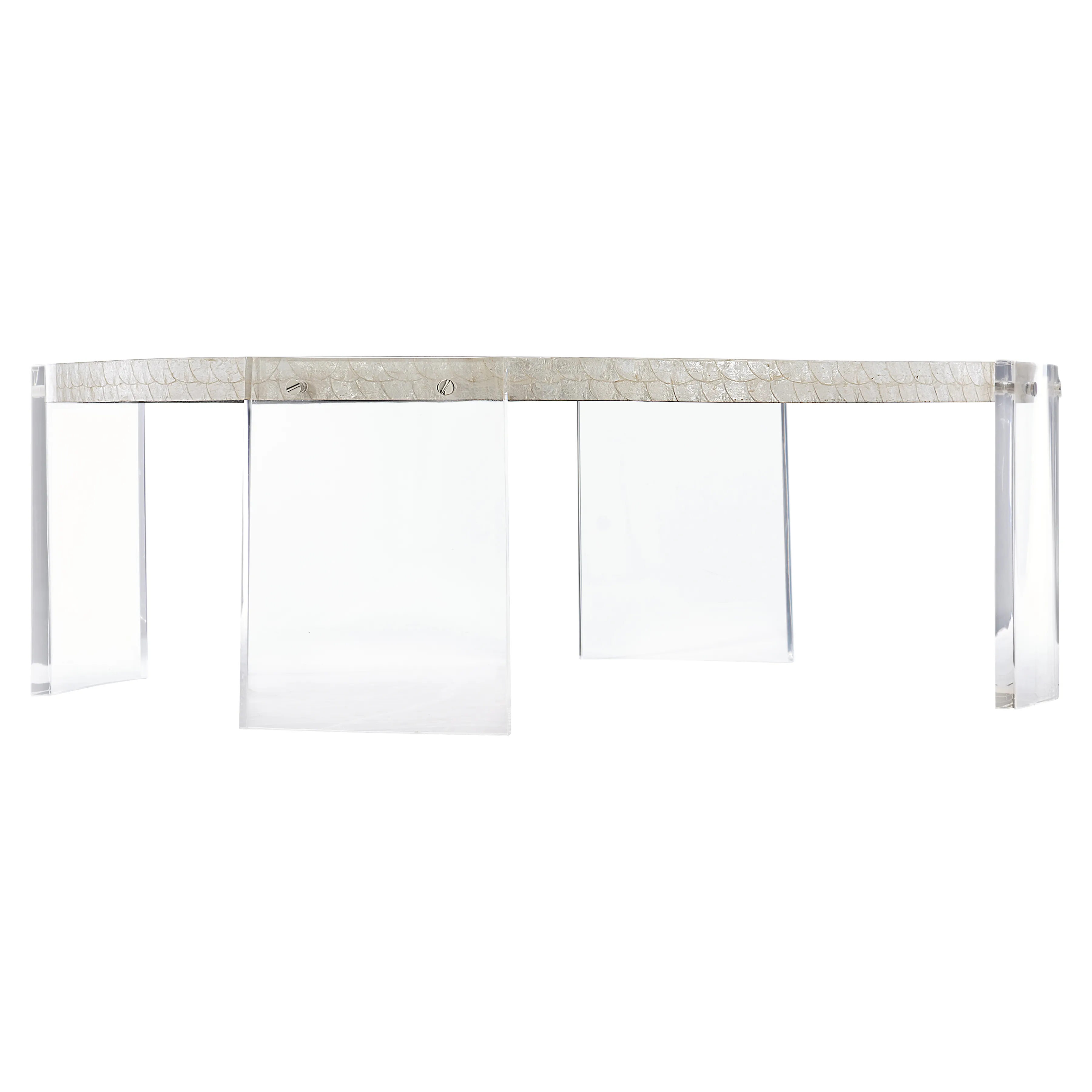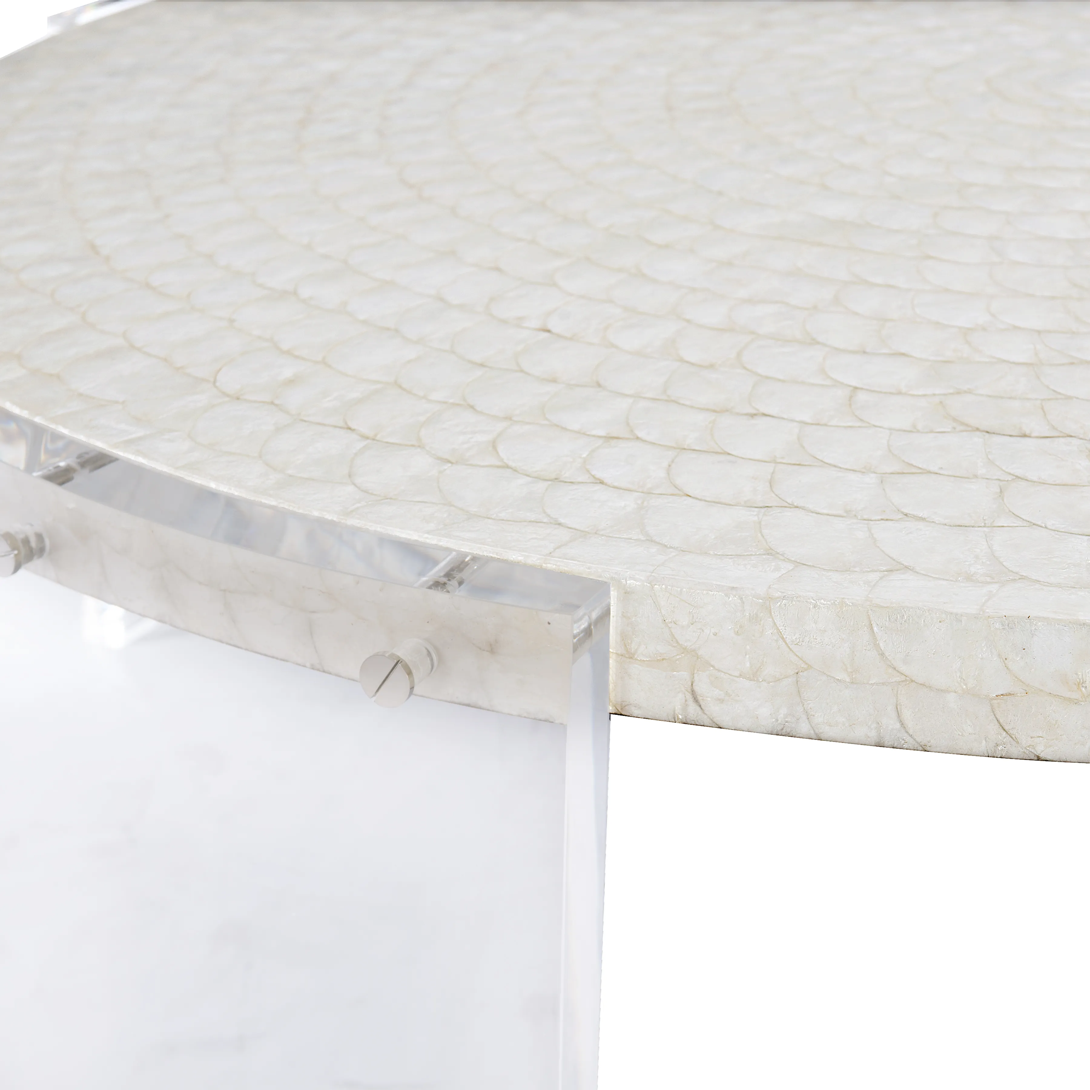 The Pearle cocktail table offers a unique material story, blending capiz shell with acrylic for a singular look. The luminescence of the shells lends a glamorous mystique, while clear leg panels with bright metal hardware bring a sleek, contemporary edge. Casual elegance and modern style meet in this breathtaking piece.