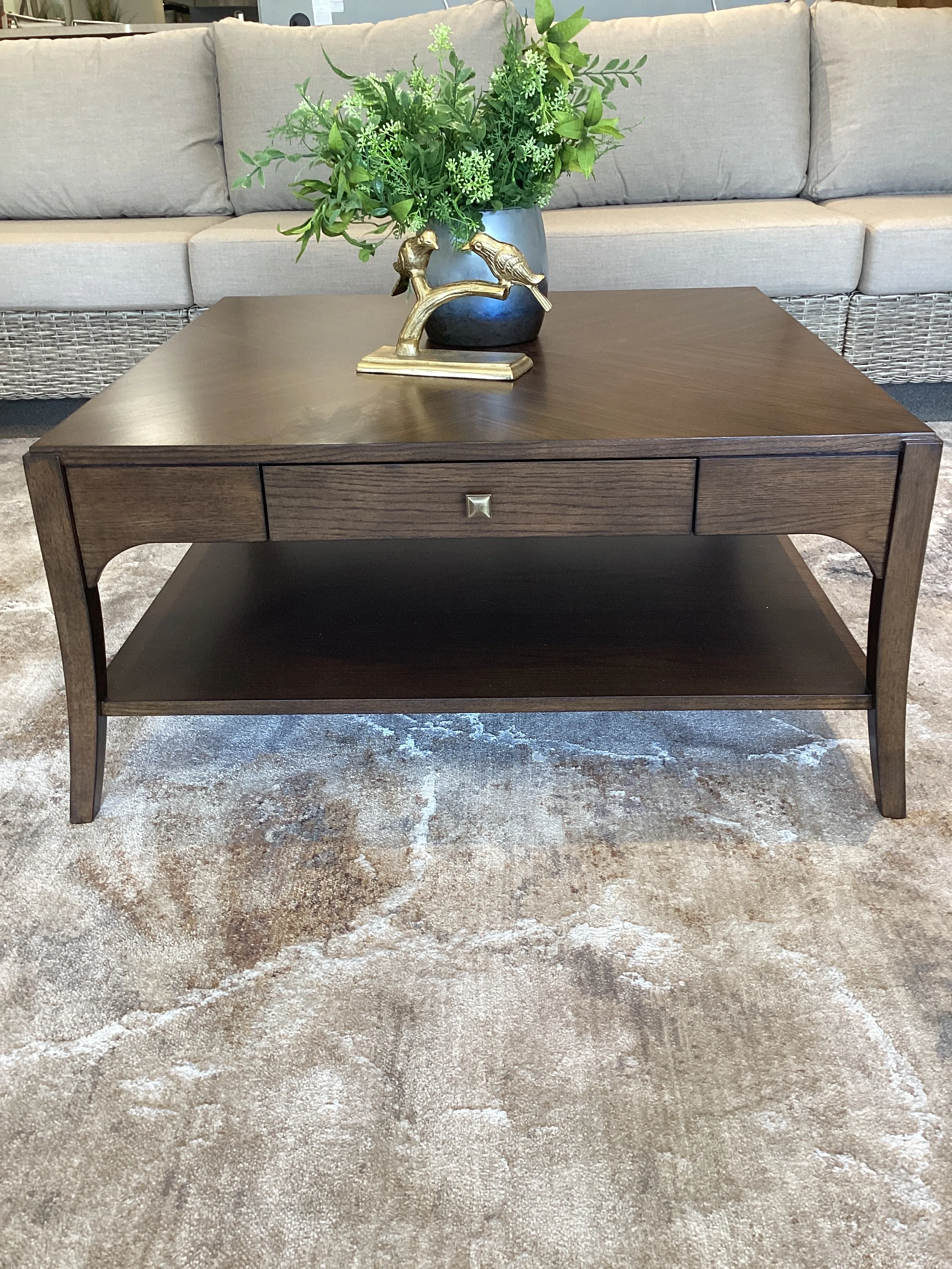 Drawer provides a space to store magazines, remotes, and other living room essentials