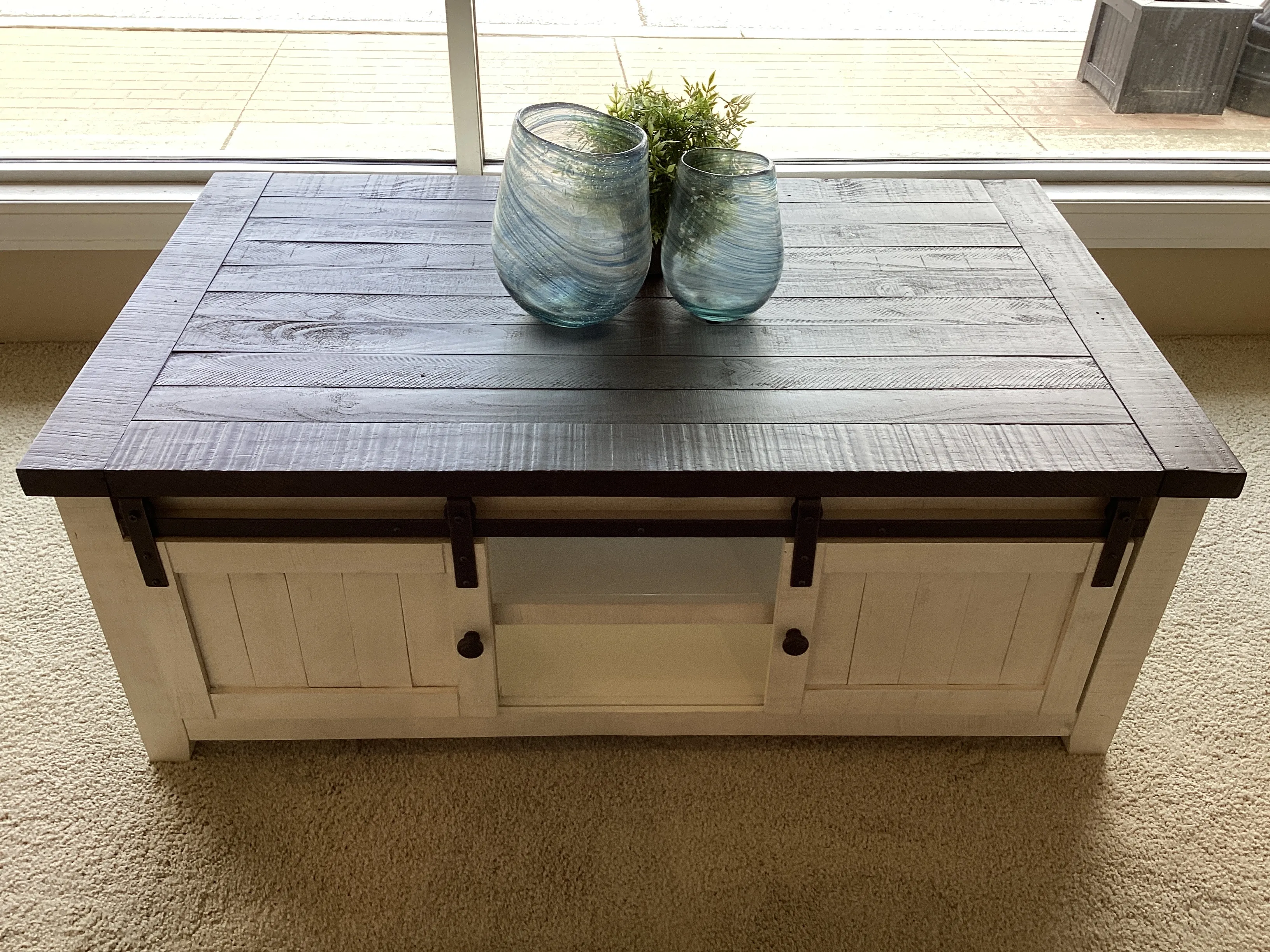 Experience the elegance of rustic farmhouse craftsmanship with the Madison County Collection. Made from solid reclaimed Pine, each piece showcases the natural beauty of the wood through unique weathering and intentional stress markings. Upgrade your living room with the comfortable and sophisticated style of this 50" Barn Door Coffee Table. With plenty of storage and two rolling barn doors on each side, this country-style accent will make a wonderful upgrade to your home.
