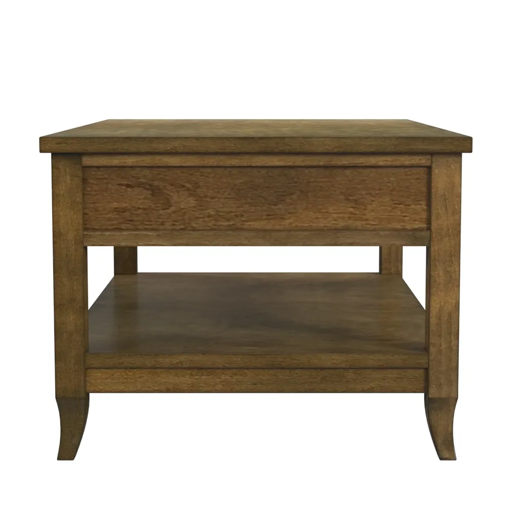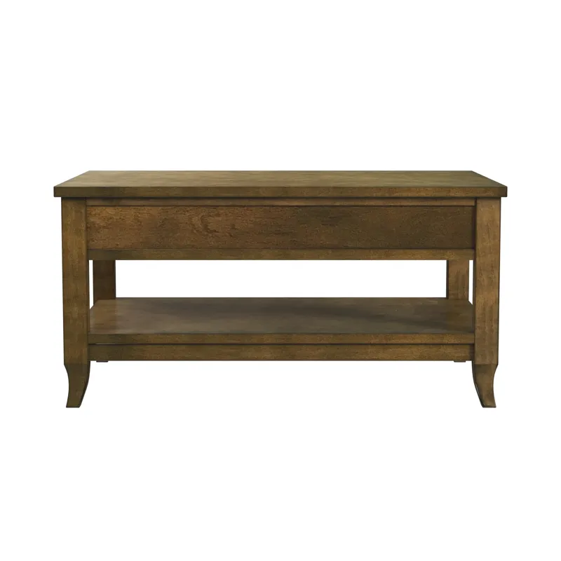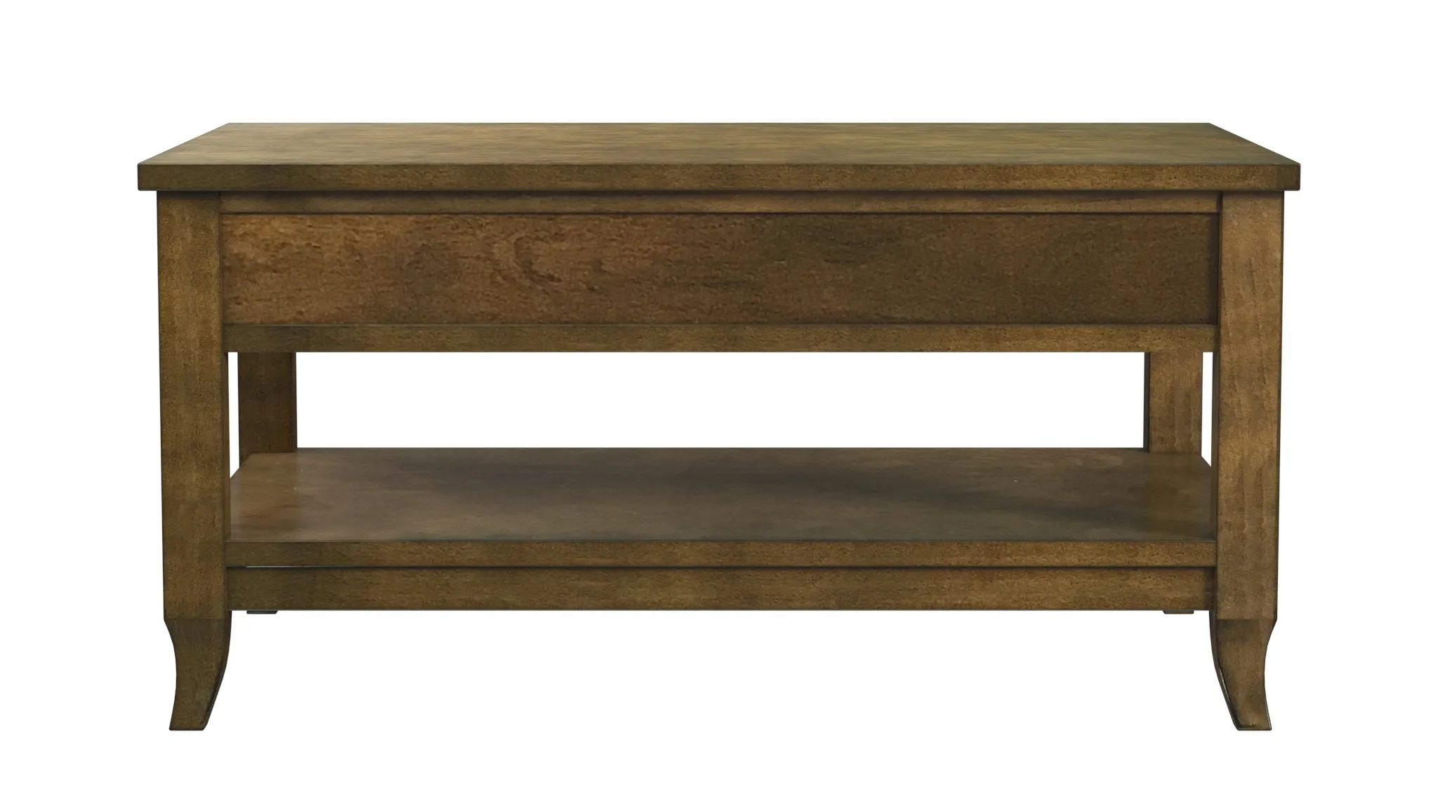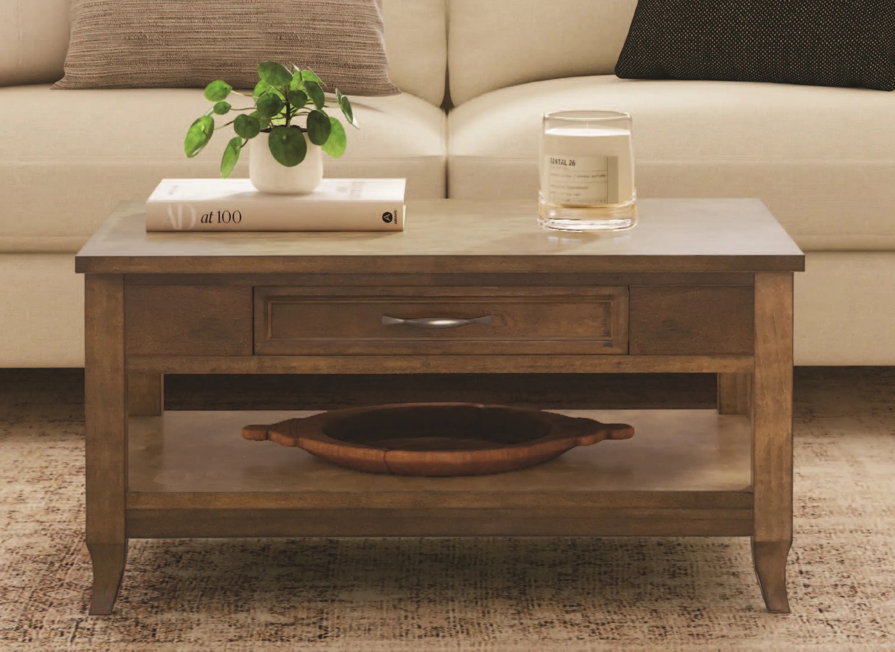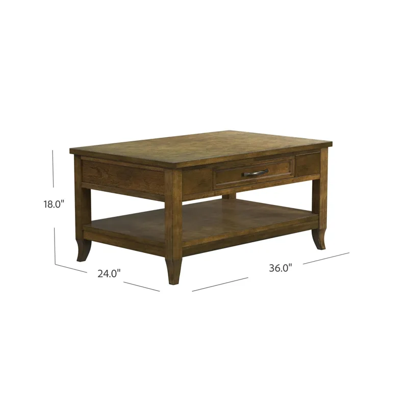 Enhance your living space with the Salem Collection's rectangular cocktail table, the perfect centerpiece for your living room, combining functionality and timeless elegance. Its classic design and thoughtful details make it a stunning addition to any decor. The cocktail table features tapered, curved feet that add a touch of sophistication and charm. These beautifully shaped feet not only provide stability but also enhance the overall aesthetic of the table. Crafted with high-quality materials, this cocktail table is constructed using birch veneer and poplar solids. The birch veneer offers a smooth and polished surface, while the poplar solids provide durability and strength, ensuring that the table will withstand everyday use. The toasted almond finish creates an inviting atmosphere and complements a variety of color schemes and decor styles. Its neutral tone allows for easy coordination with other furniture pieces in the room. Functionality is a key feature of this cocktail table. It includes one convenient drawer, offering storage space for small items such as remote controls, coasters, or other essentials. The drawer is adorned with an antique brass handle, which adds a touch of vintage charm. In addition to the drawer, the cocktail table also features a lower shelf. This open shelf provides a perfect opportunity to display decorative items or store books and magazines, adding versatility and additional storage space to the table. It allows you to keep your living area organized and clutter-free. The rectangular shape of the cocktail table offers a spacious surface area, providing plenty of room for placing items such as coffee table books, trays, or decorative accents. Whether you're hosting gatherings or simply enjoying a relaxing evening at home, this table offers a convenient and stylish spot to gather around. It seamlessly blends with various decor styles, from traditional to transitional and beyond. Make a statement in your living room with this stunning cocktail table.
