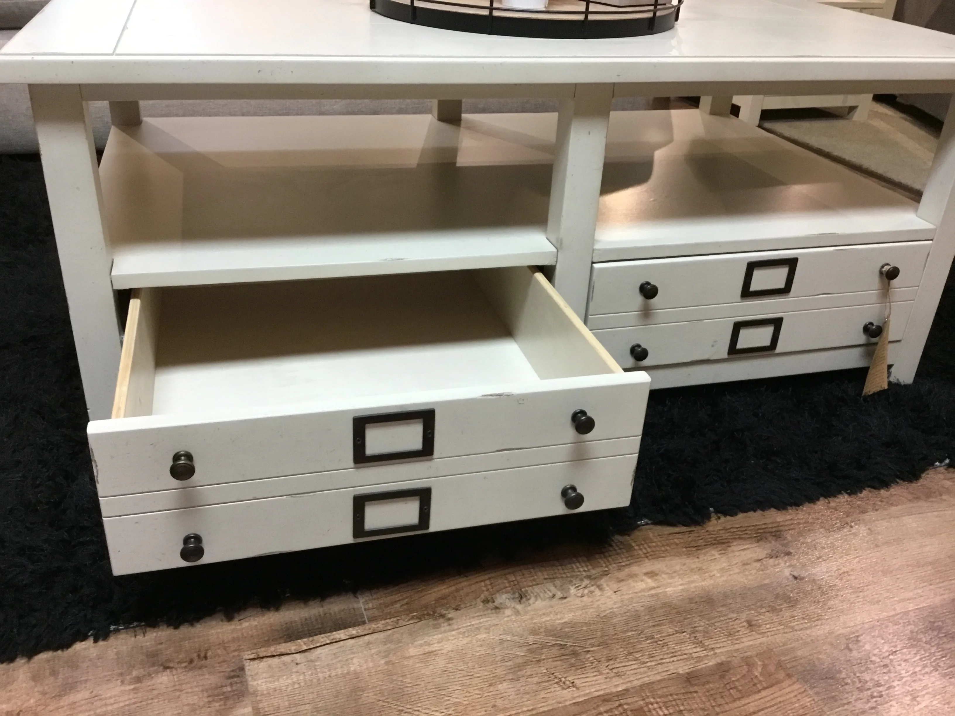 Two drawers have dovetail joinery and ball bearing extension guides