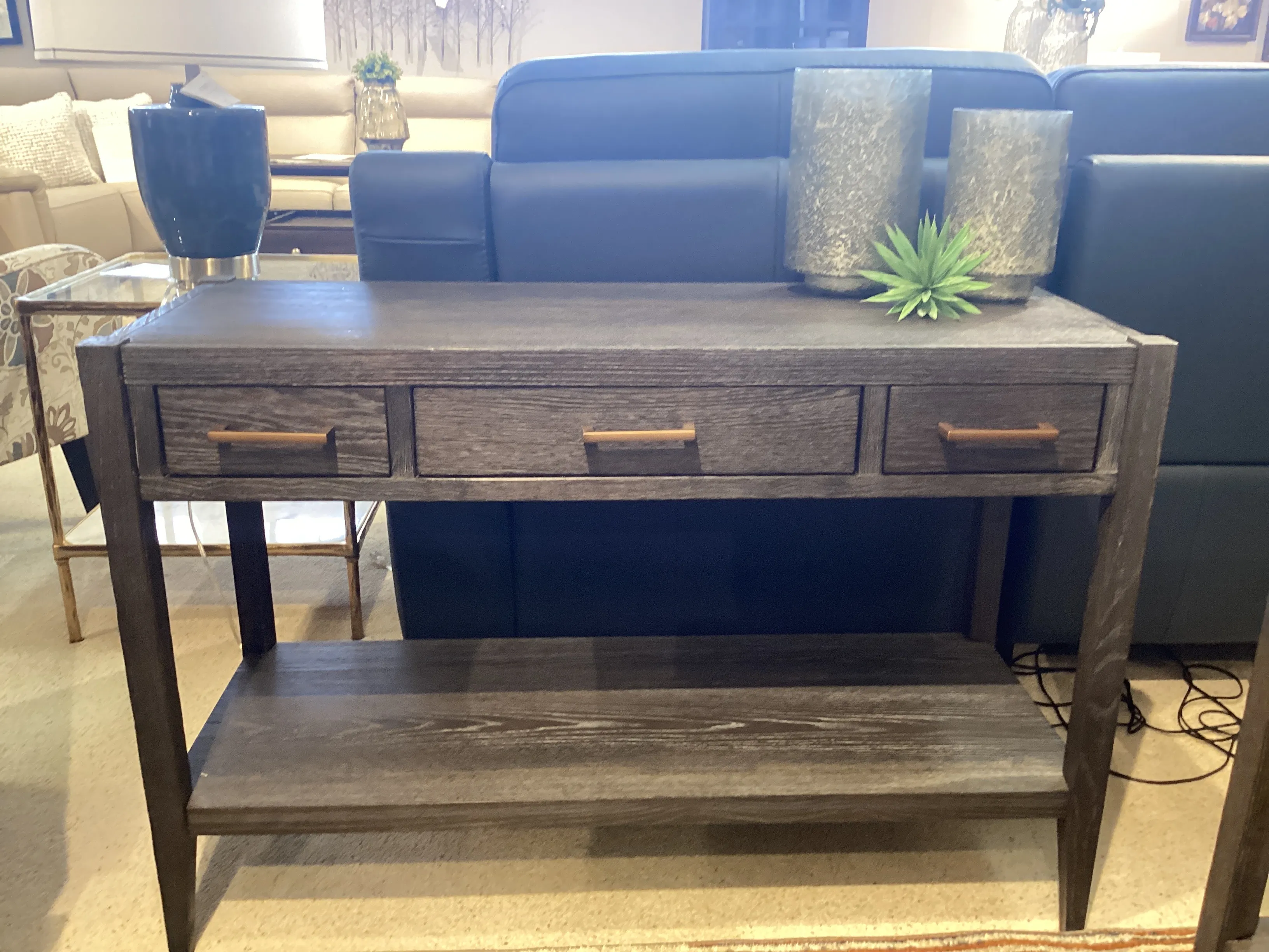 This collection is comprised of seven pieces with plenty of storage and function designed into each piece. Two different cocktail tables, including a large rectangle with three drawers and also a bunching ottoman offer a choice depending upon the size of the space. Additionally, the shelves and drawers on selected pieces not only enhance the design but provide further storage capability as well. Oak veneer and Baichun solids in an Espresso finish with vintage brass finished decorative hardware.