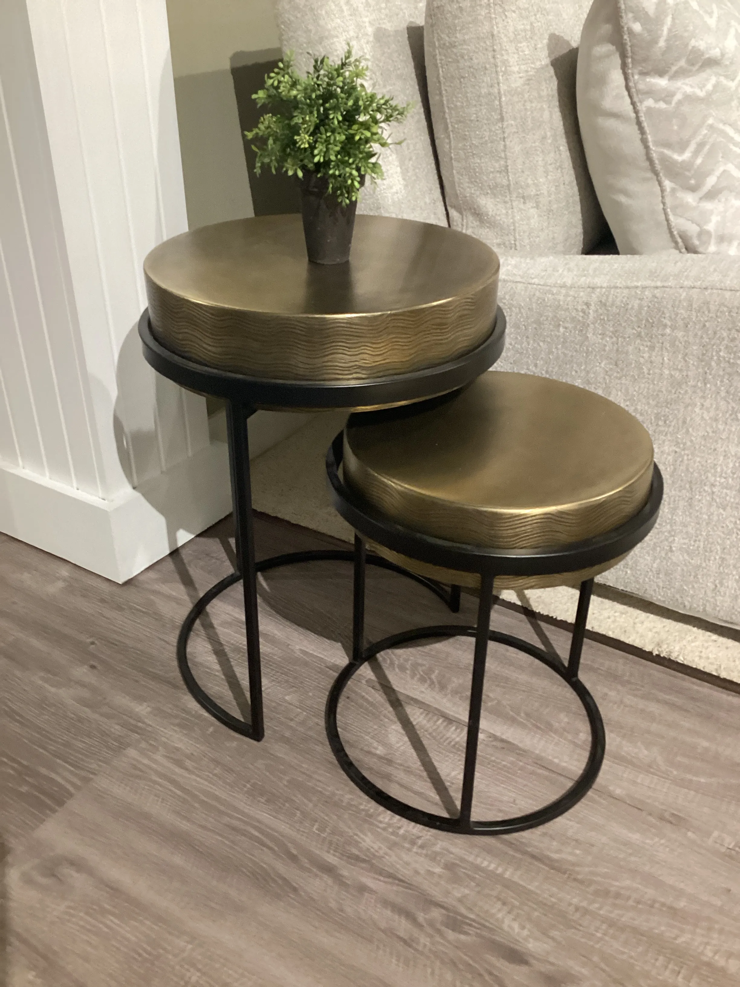 Step away from traditional looks in your home with this pair of Crestview Collection Hudson Textured Brass Nesting Tables. Their modern style works well in most spaces, with a brushed brass tone finish on top and black metal supports below. The pair of tables saves space in any tight layout by nesting together, or spread them out in a room for one cohesive look.