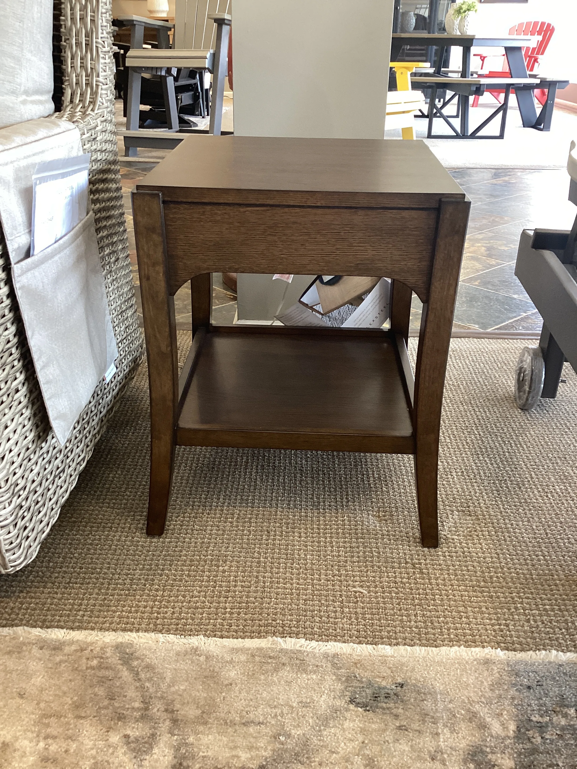 Constructed of rubberwood solids and white oak veneers in a rich, chestnut finish