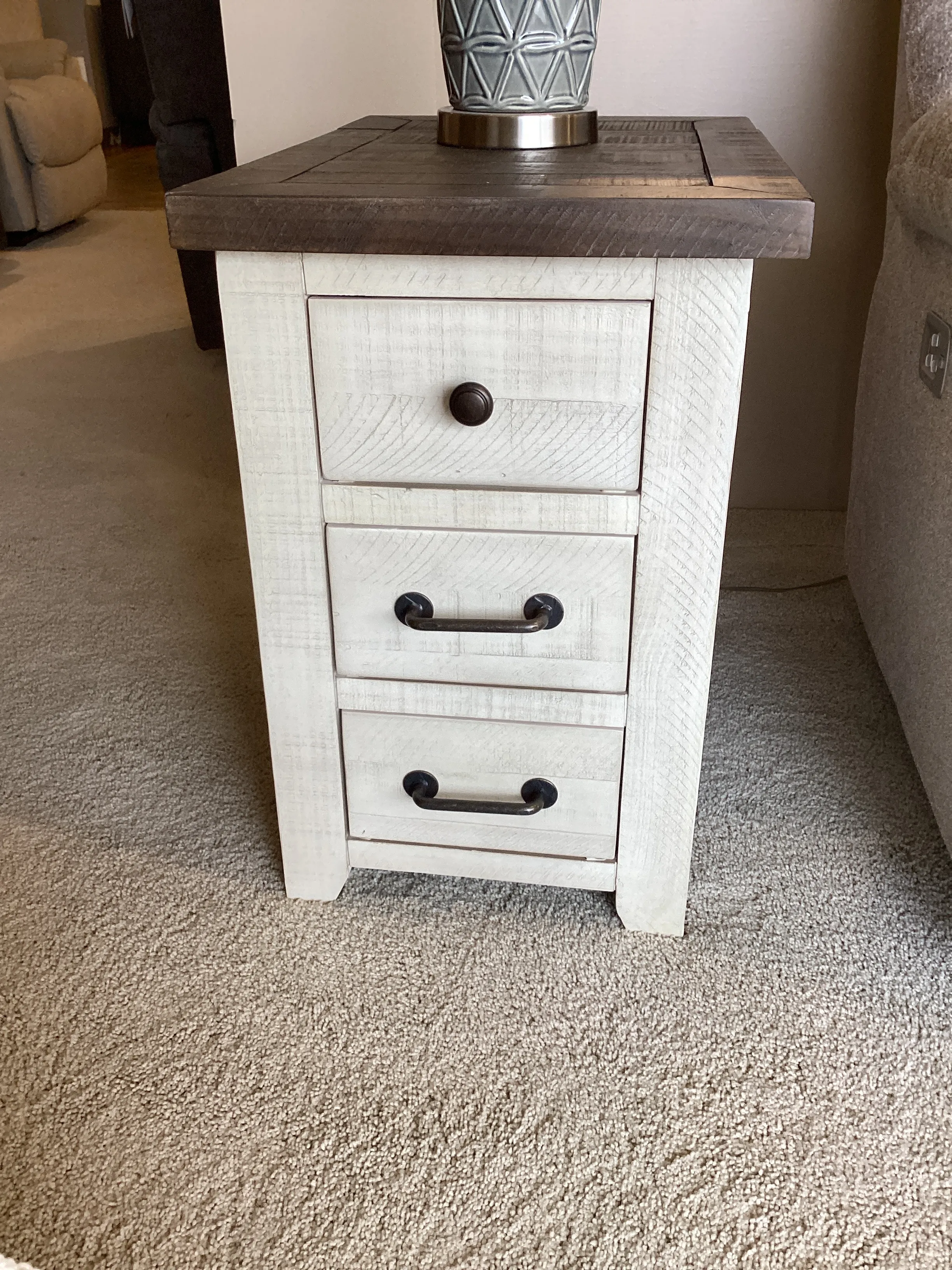 Experience the elegance of rustic farmhouse craftsmanship with the Madison County Collection. Made from solid reclaimed Pine, each piece showcases the natural beauty of the wood through unique weathering and intentional stress markings. Upgrade your living room with the comfortable and sophisticated style of this USB Charging Chairside End Table. With three built-in storage drawers and hidden USB power outlets perfect for powering all of your devices.