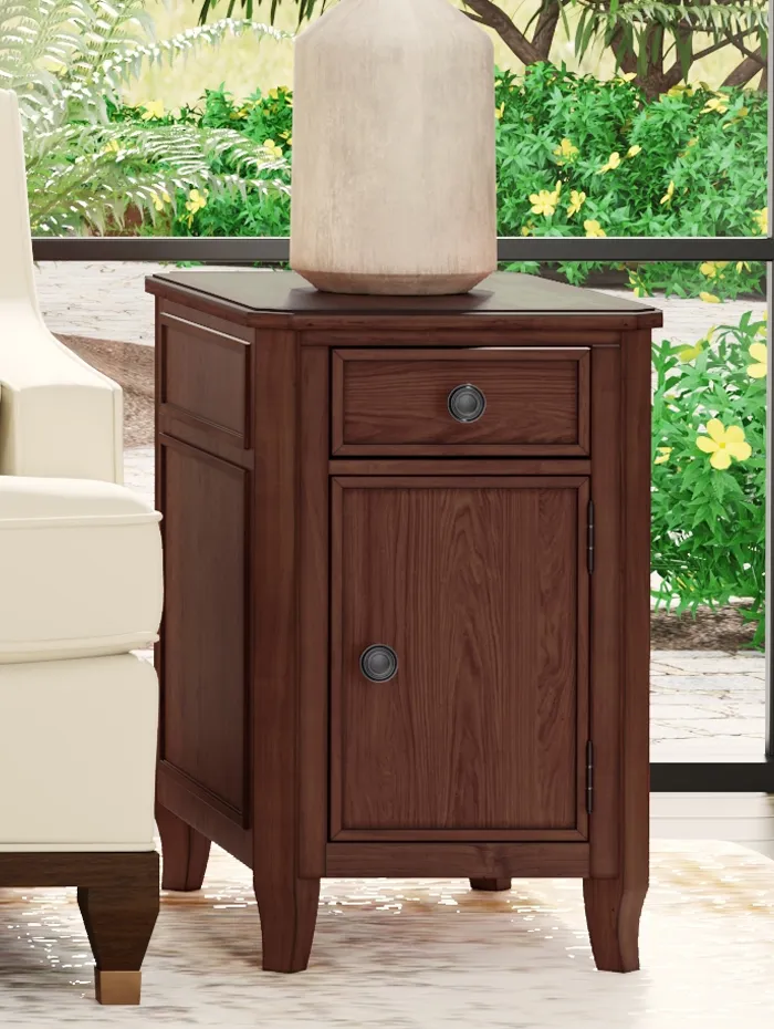 Chesterbrook brings timeless elegance and functional design to your living space. Crafted from poplar solids and cherry veneer, each piece showcases the rich, warm tones of the Autumn Harvest finish, adding a touch of sophistication to your decor. The collection features concave legs, clipped corners on the tops, and framed drawer fronts, creating a refined silhouette that exudes traditional charm. Round antique brass drawer knobs add a subtle yet elegant finishing touch, enhancing the overall aesthetic of the collection.