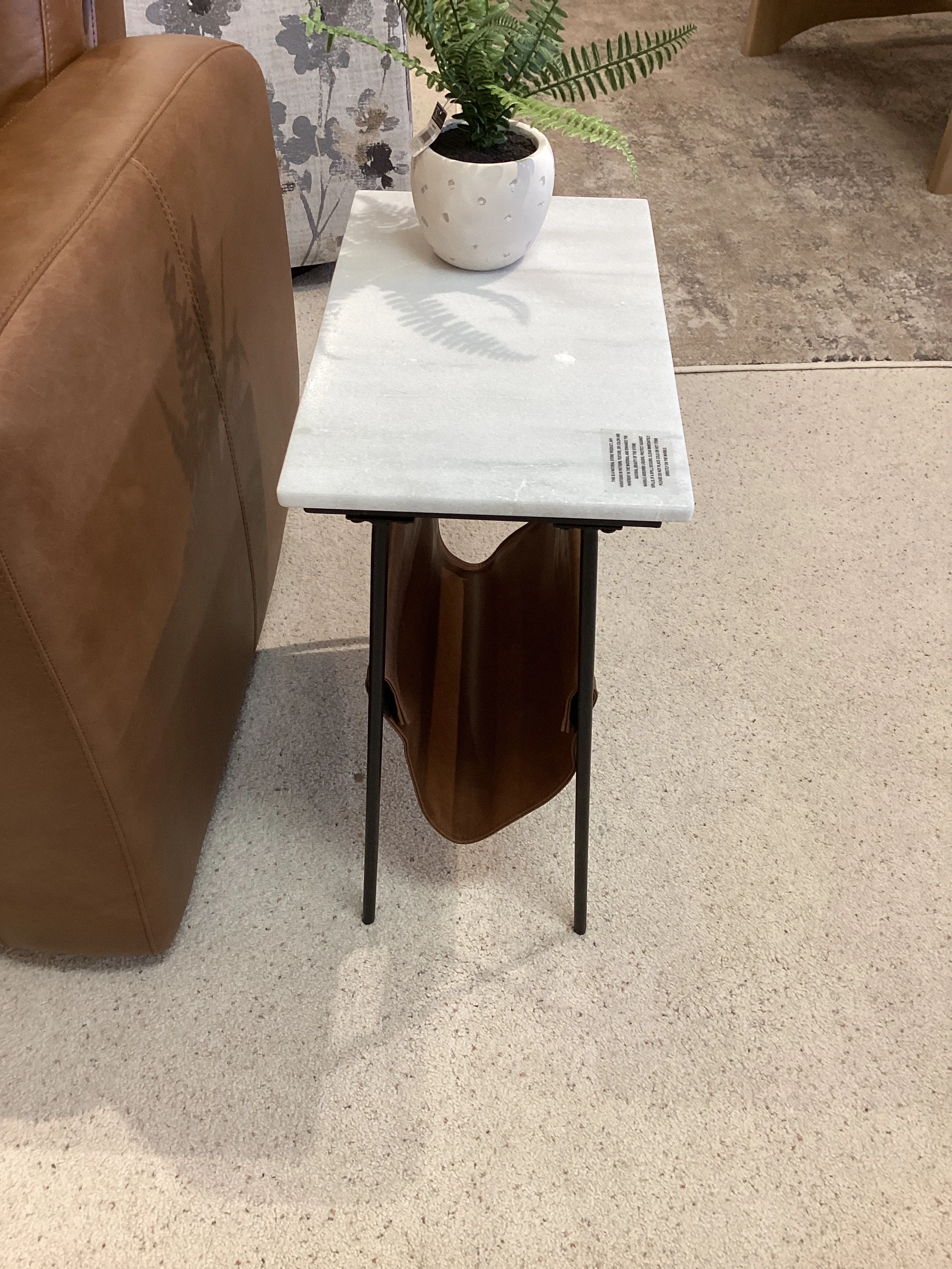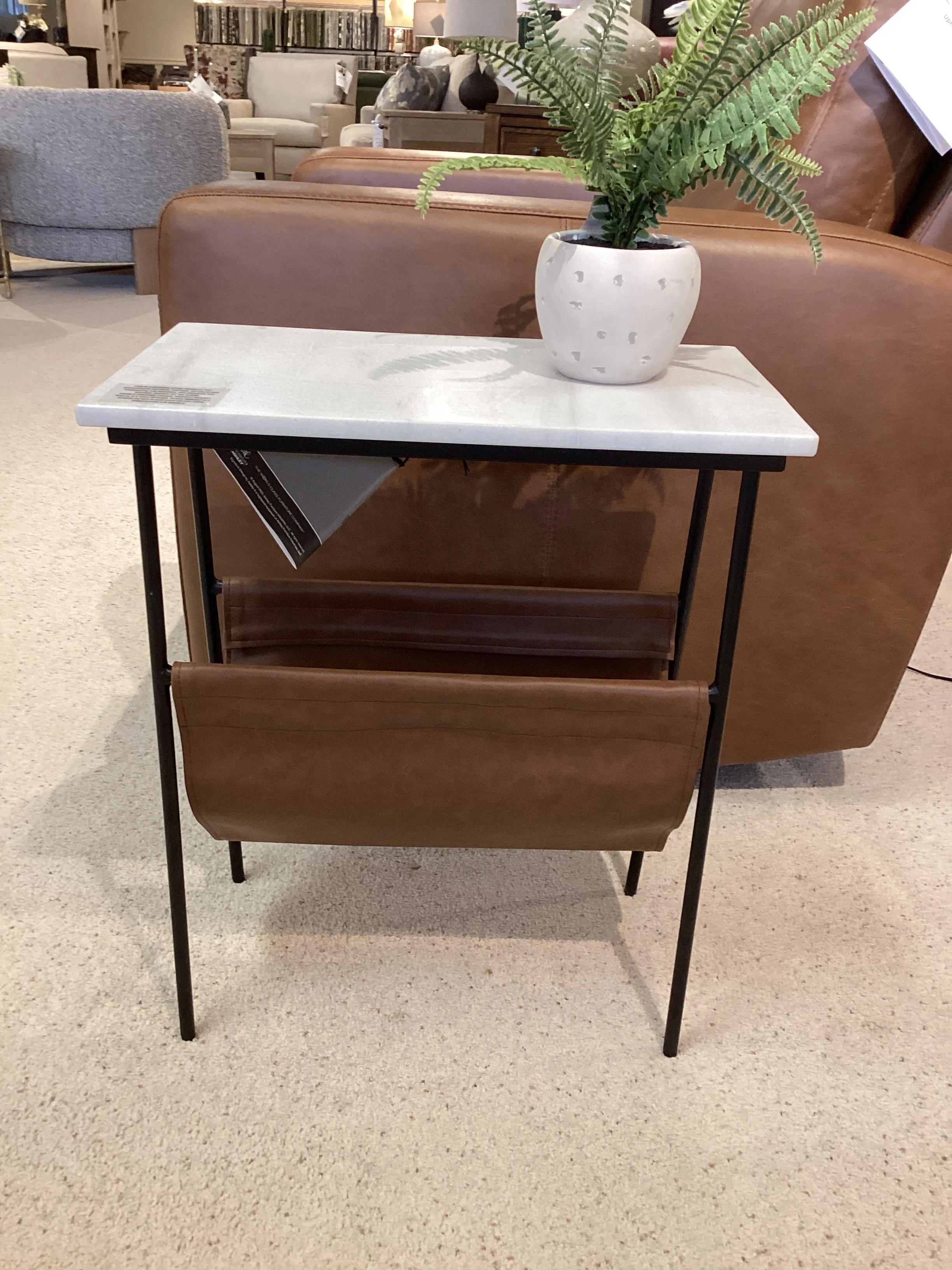 With its mixed media design, this accent table with magazine holder is what's new-and what's you. Fusion of black metal, white marble and brown faux leather creates a contemporary aesthetic that's the genuine article.