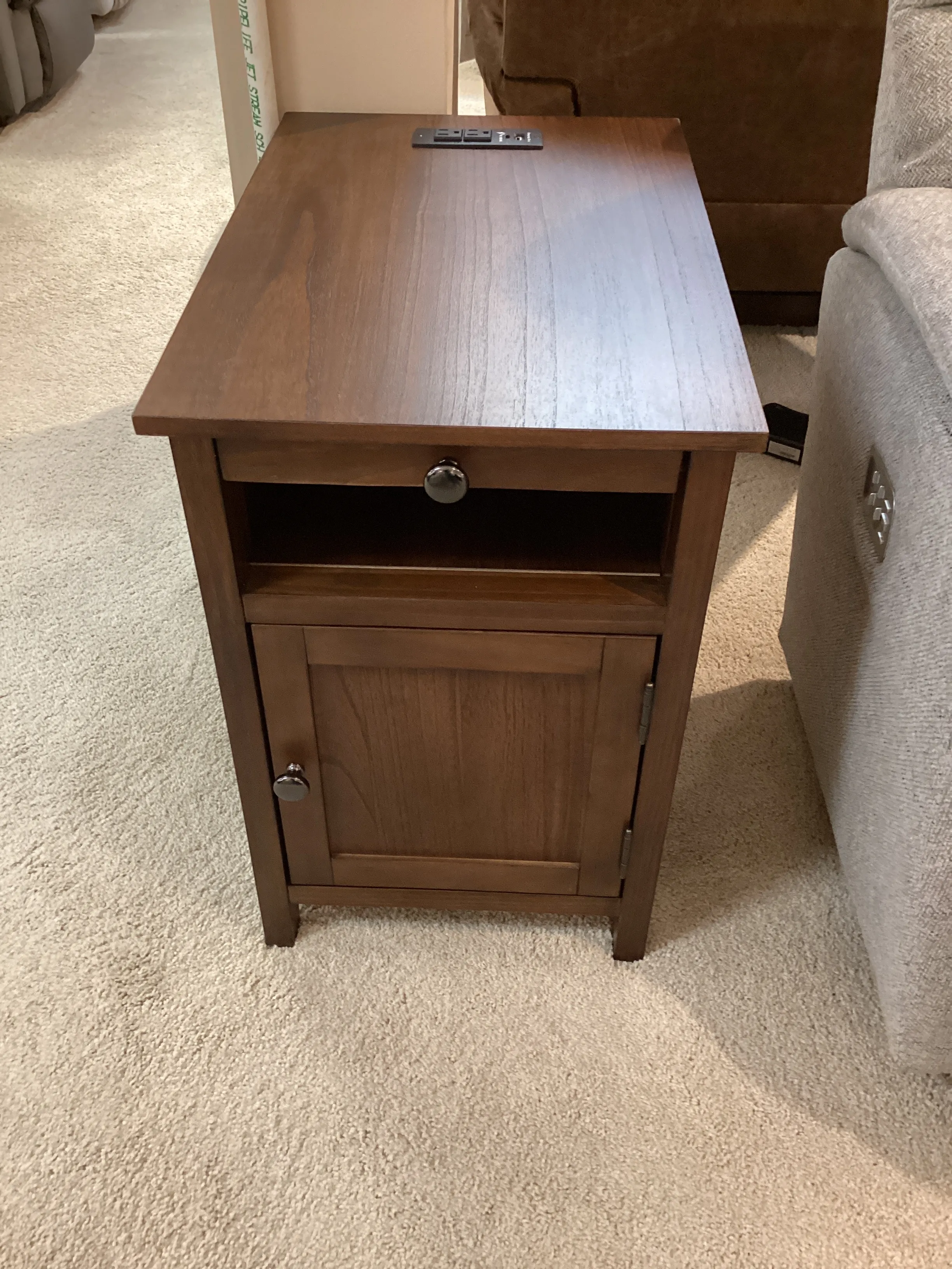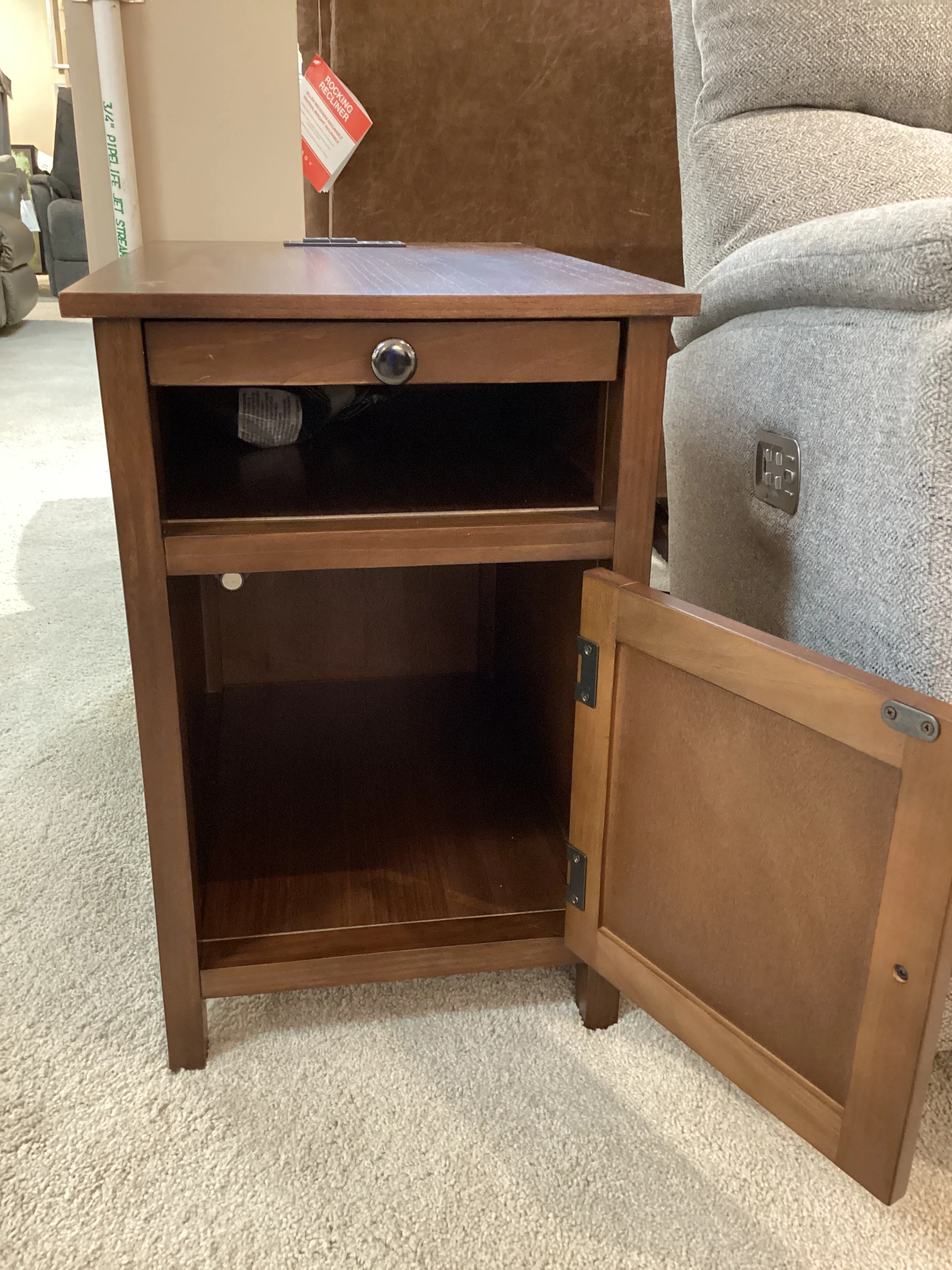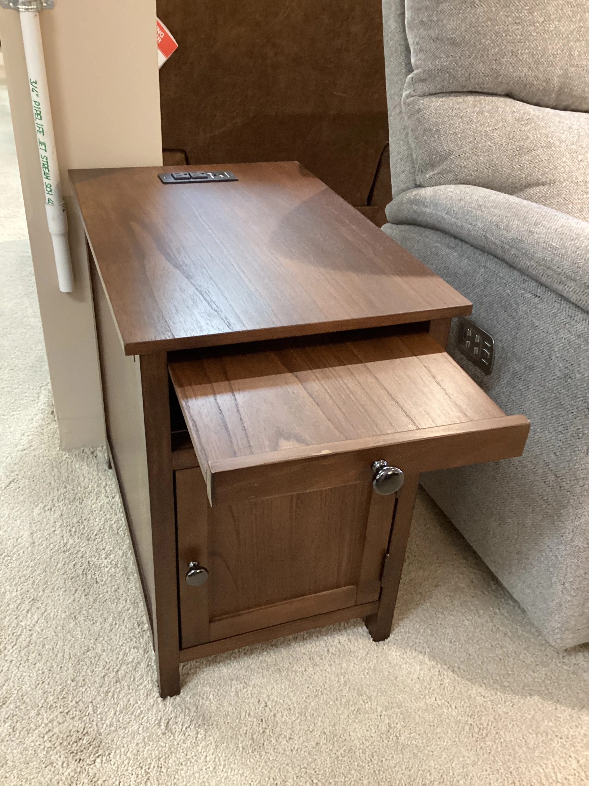 Add big character to a small space with this chairside end table. With its compact size and strong silhouette, it can go anywhere and blend easily into the decor. Less is so much more with the Shaker-inspired design and warm brown wood tone finish. Loaded with form and function, this end table displays accent pieces and stores essentials securely while keeping devices powered up.