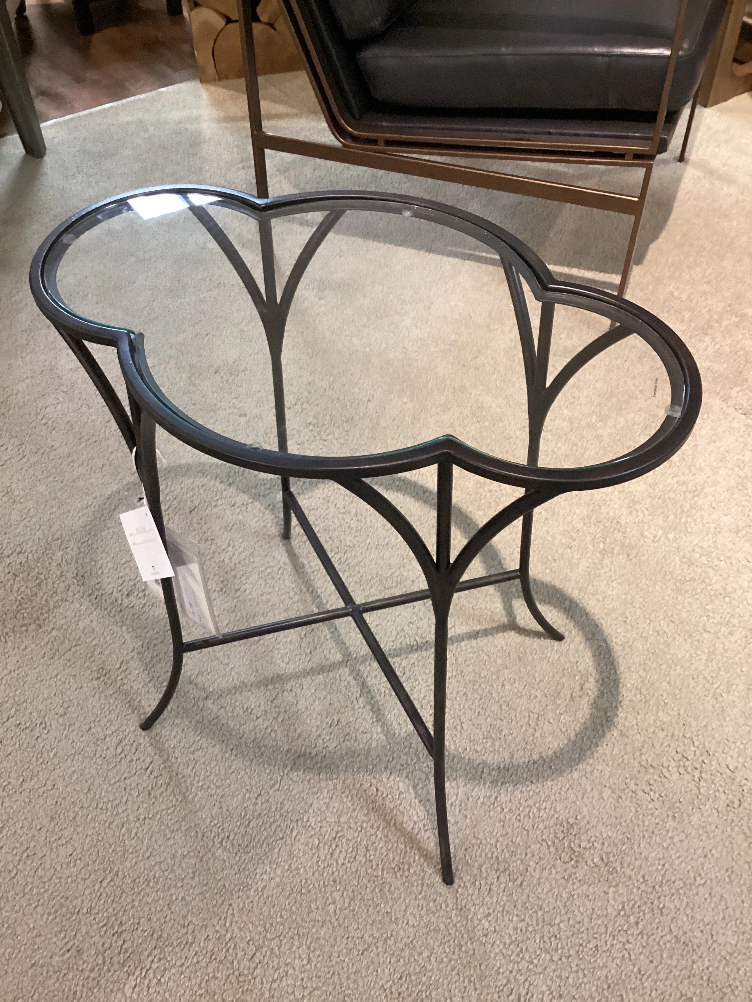 Whimsically Designed With Moroccan Roots, This Accent Table Features A Hand Forged Iron Framework Finished In Aged Black With A Scalloped Top With Clear Tempered Glass.