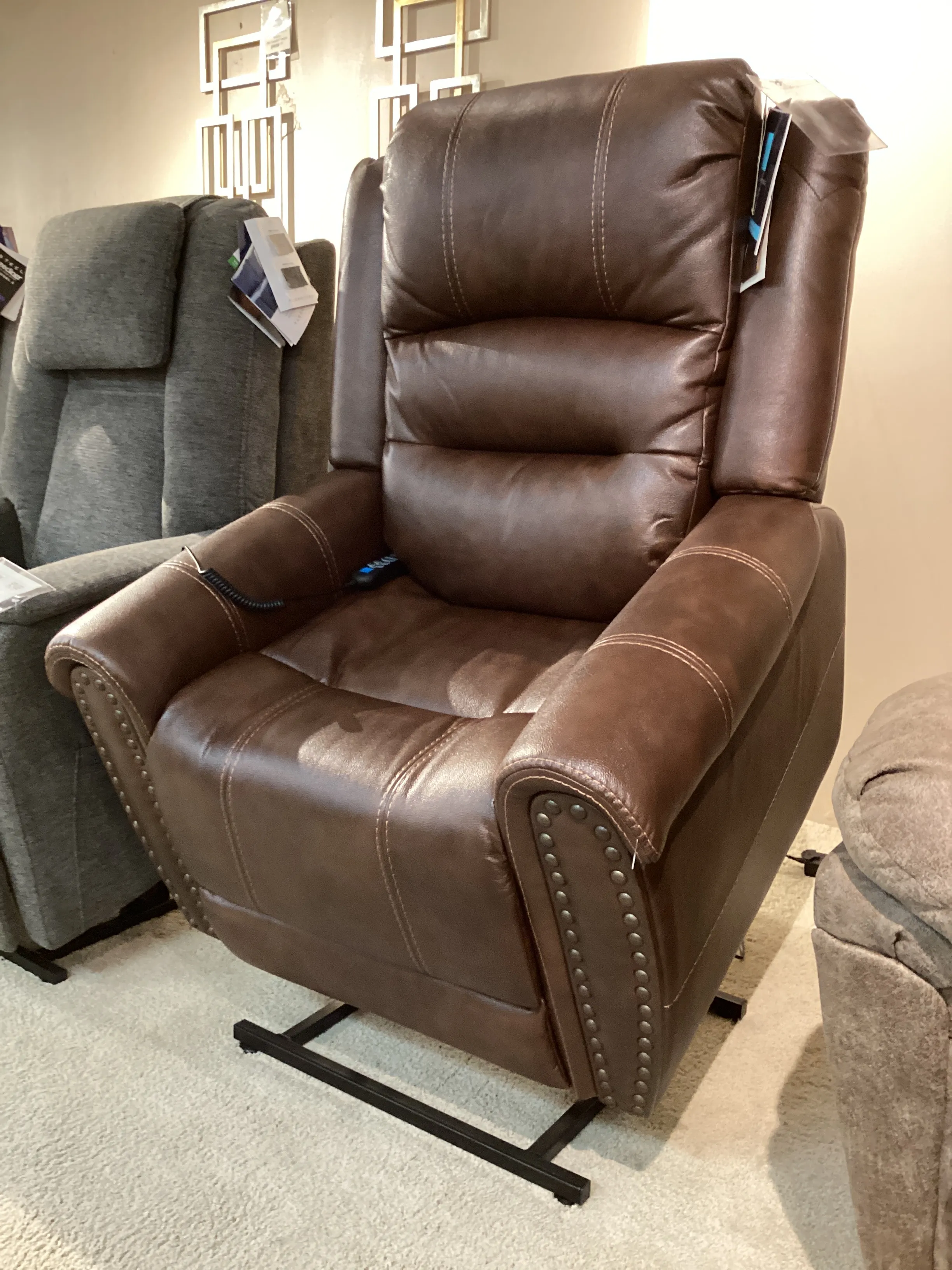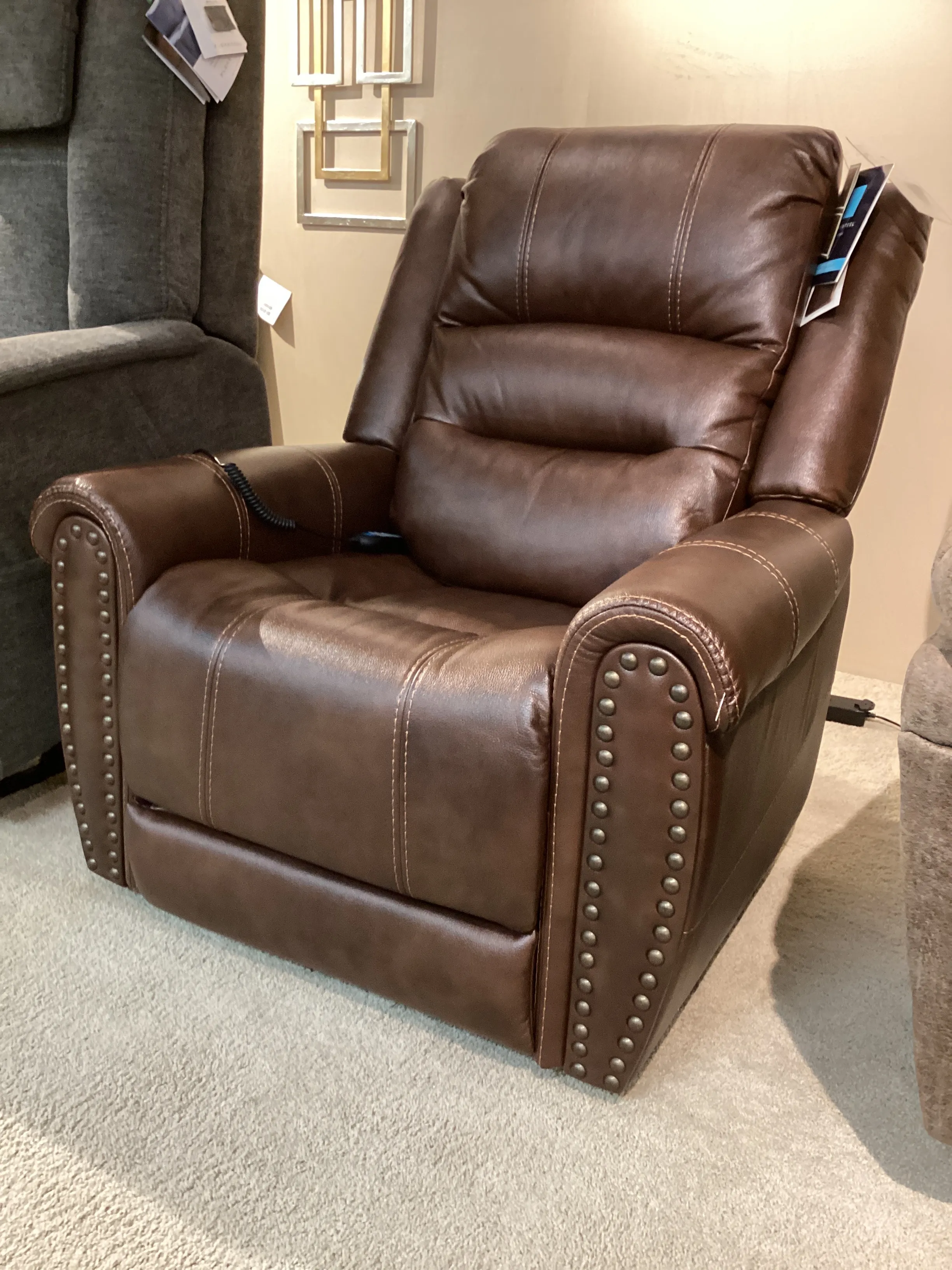 The generous padding and heavy-thread stitching detail of the Oscar power lift recliner with power headrest instantly grabs your attention and welcomes you to take a seat. Nailhead trim traces the edges of the arm fronts to highlight the welcoming silhouette, while an extended footrest provides additional leg rest space for taller users. Customize your sit with power recline and headrest that can be adjusted at the touch of a button. Power lift provides easy and safe assistance when getting in and out of the chair. Outfitted in a medium-toned, pumpernickel brown fabric, this recliner brings a leather look to your room with the softness and comfort of fabric.