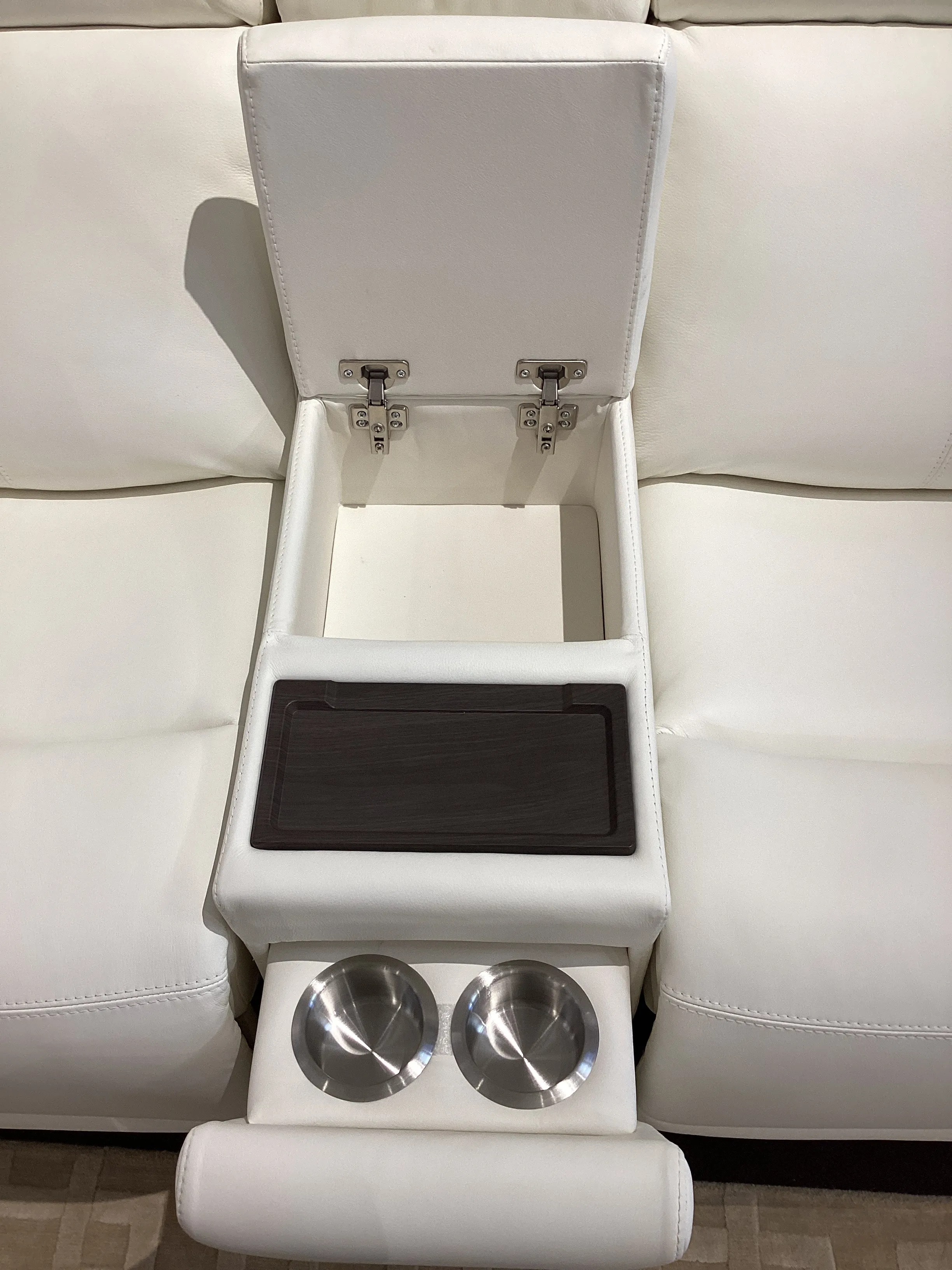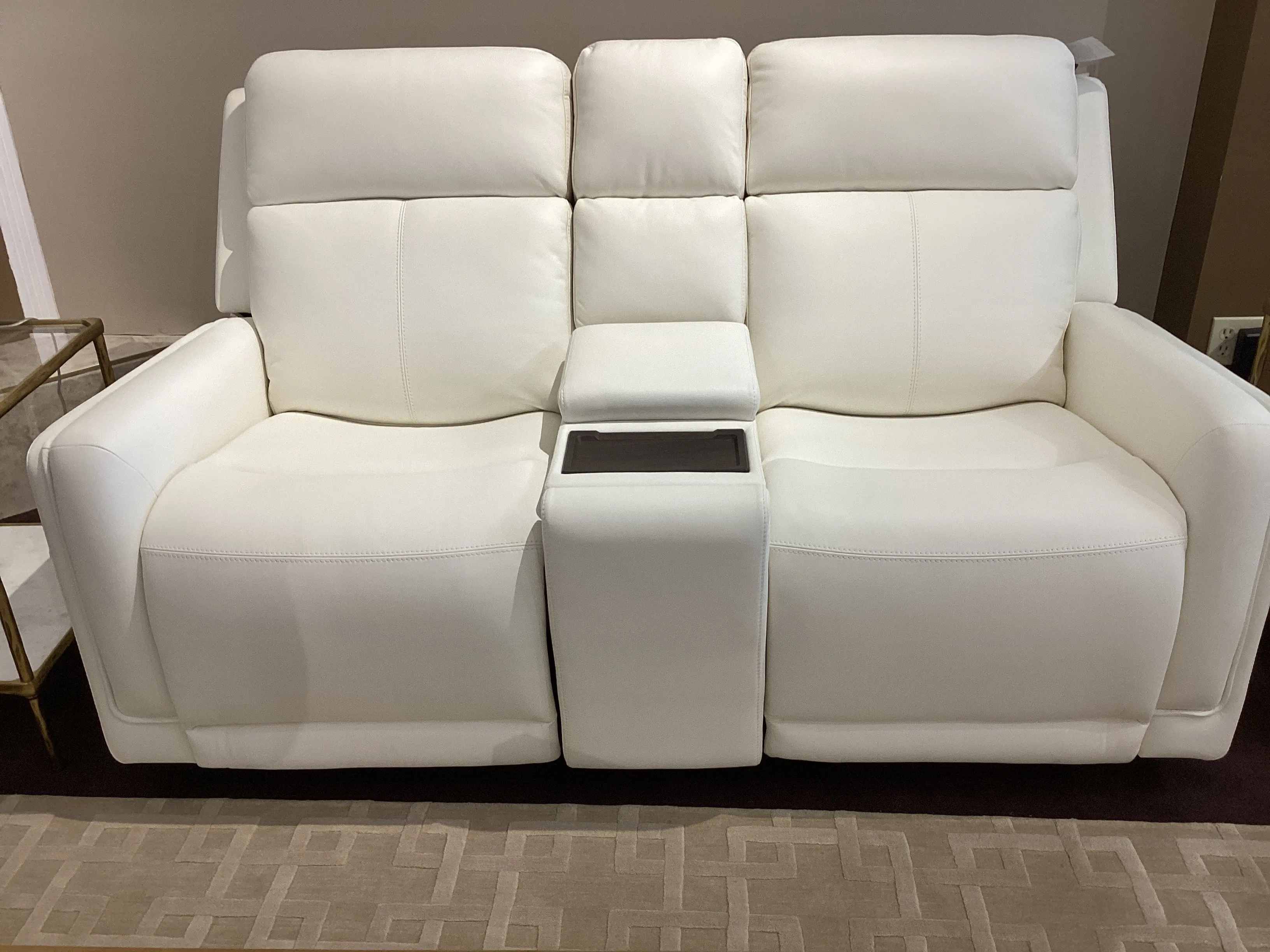 Bring your living room to the next level with the sleek, innovative Alister power gliding loveseat. This transitional style sports sleek curves upholstered in your choice of luxurious top-grain leather. A step above typical reclining, these gliding seats provide a smooth, versatile, and unique experience. The ultimate in futuristic comfort, this loveseat includes a center console with two cupholders, a wireless charging pad, and storage to keep your devices charged and within reach. Customize your comfort with a power control that adjusts recline, headrest, and lumbar support. Kick back in the Alister, the future of relaxation.