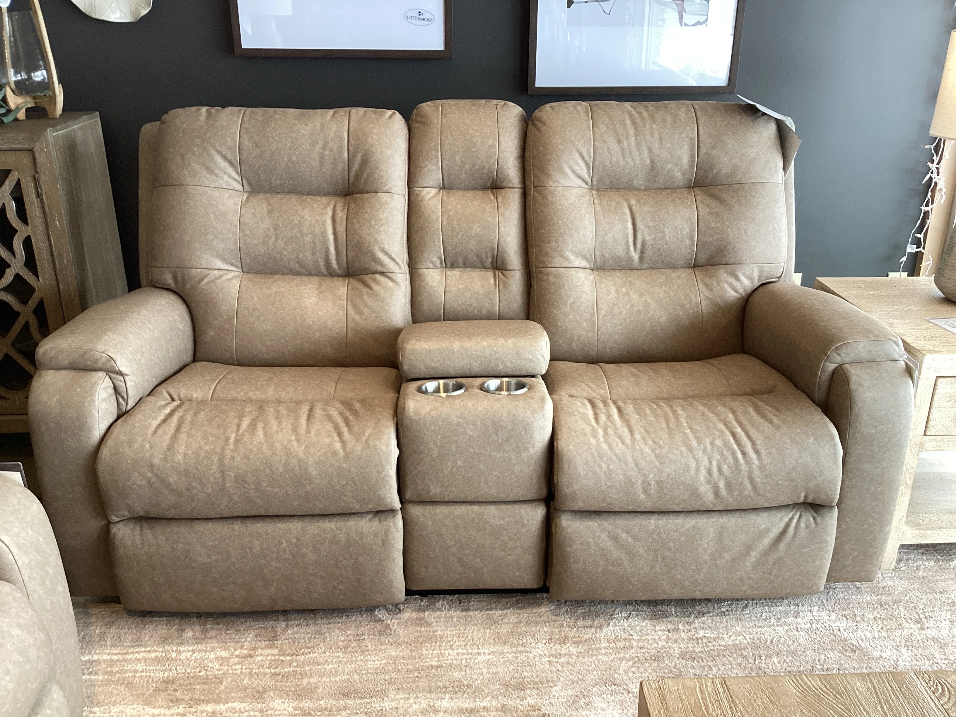 Center storage console features two cup holders and space to house remotes, magazines and other items