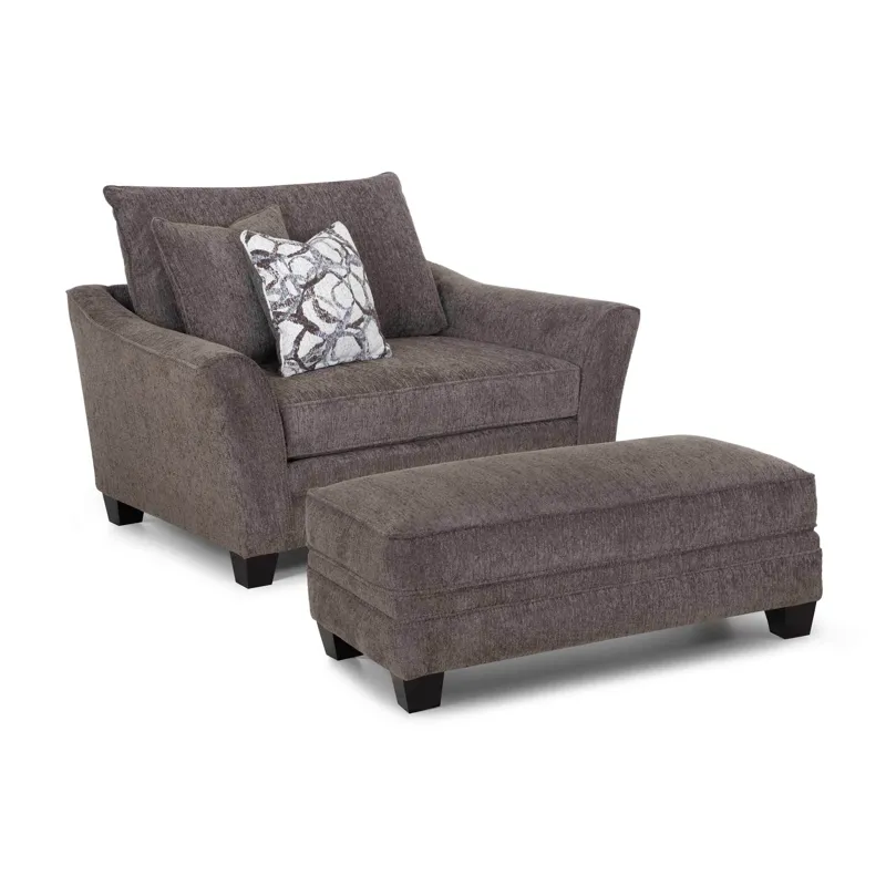 Experience a touch of “flare” with the meticulously crafted 910 Tiffani Collection. This thoughtfully designed collection includes a sofa, loveseat, chair and half and matching ottoman. All pieces are upholstered in a soft, durable gray fabric that is contrasted with coordinating accent pillows. Flared arms add a contemporary element, while solid wooden legs provide increased durability.
