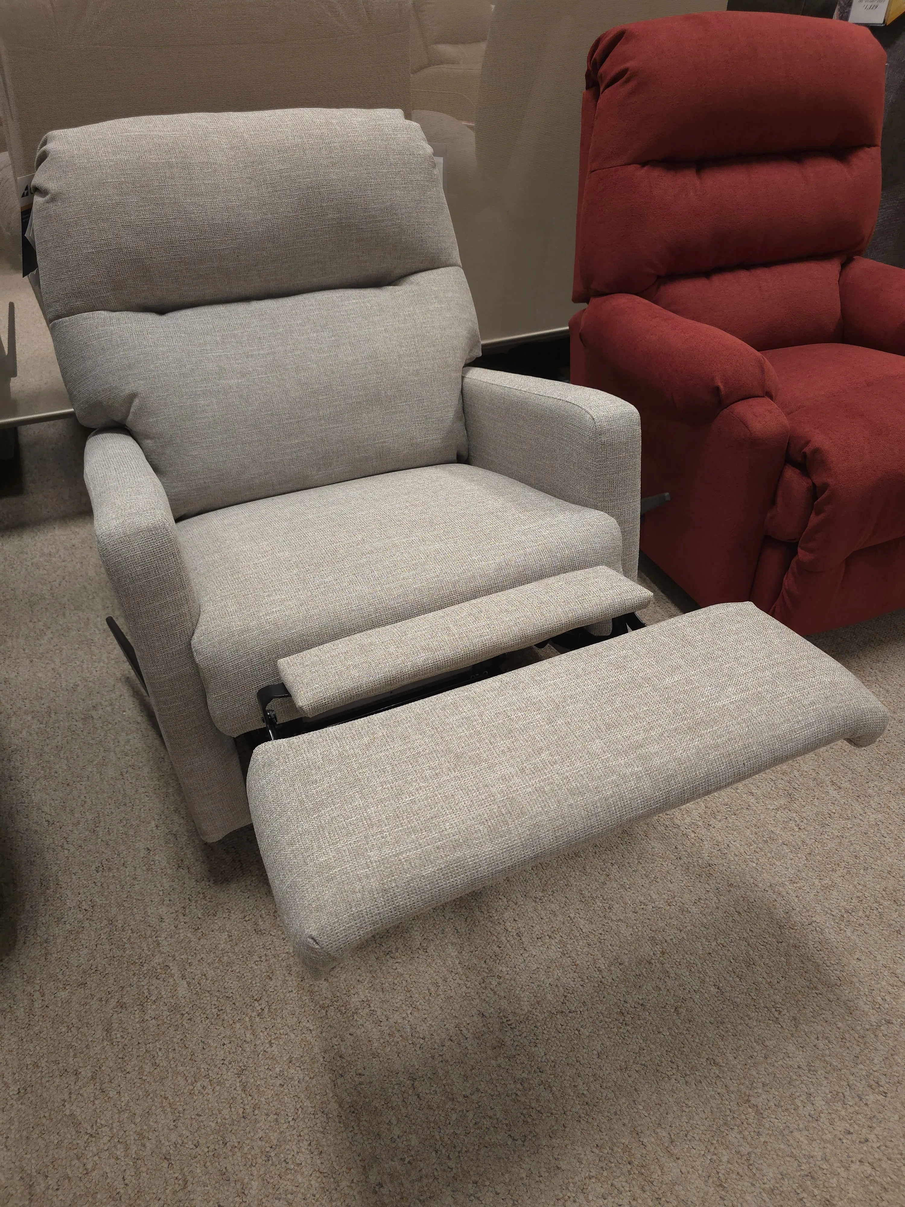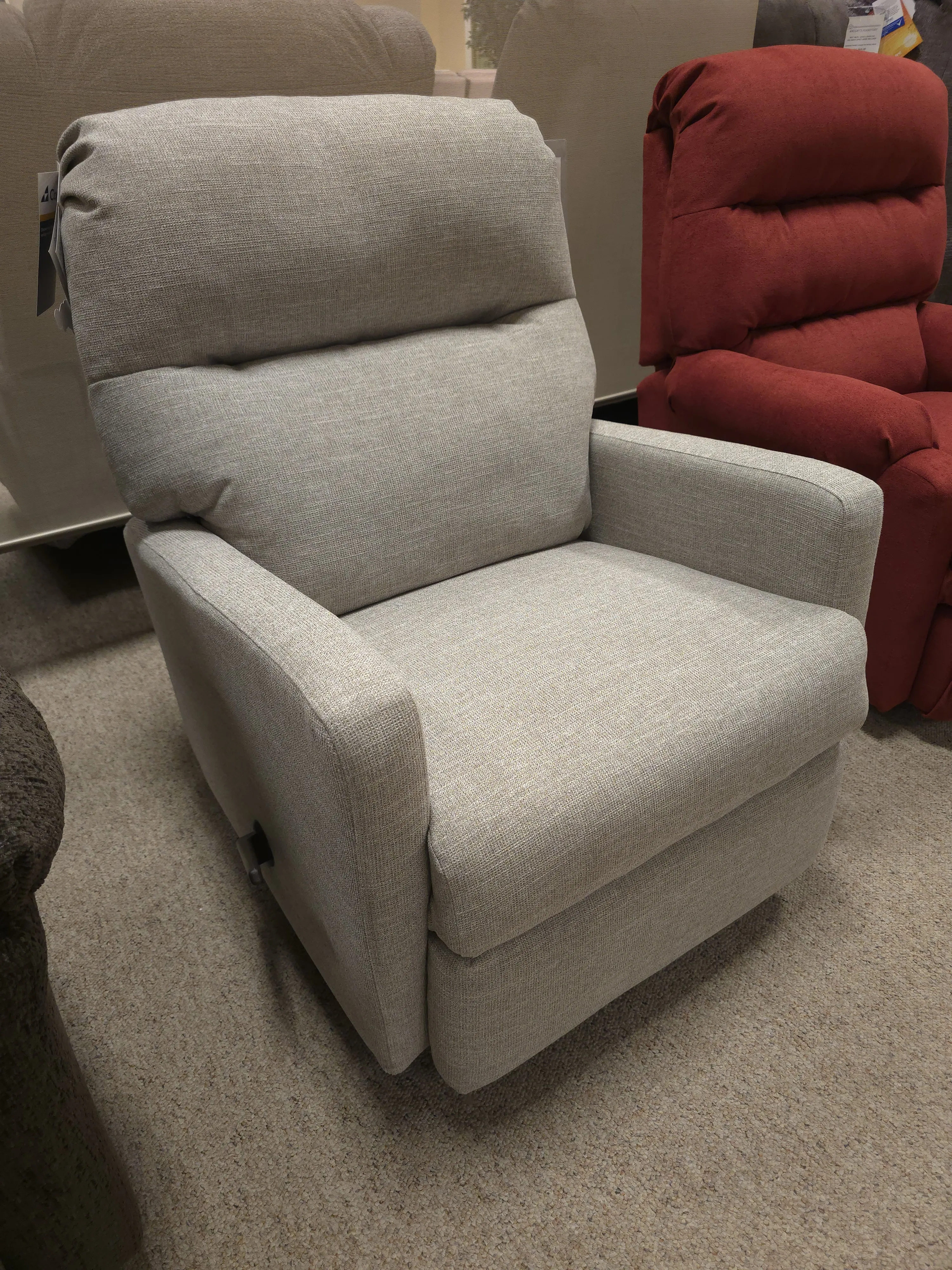 Style description: Complementing the sophisticated style of this small-scaled recliner is the generous amounts of pillow fiber cushioning in the back. The squared off arms feature lightly padded arms to maintain the sleek look. The simple silhouette is available in numerous comfort options that will allow you to stay sitting for hours on end in bliss. Made in the USA by skilled craftsmen.
