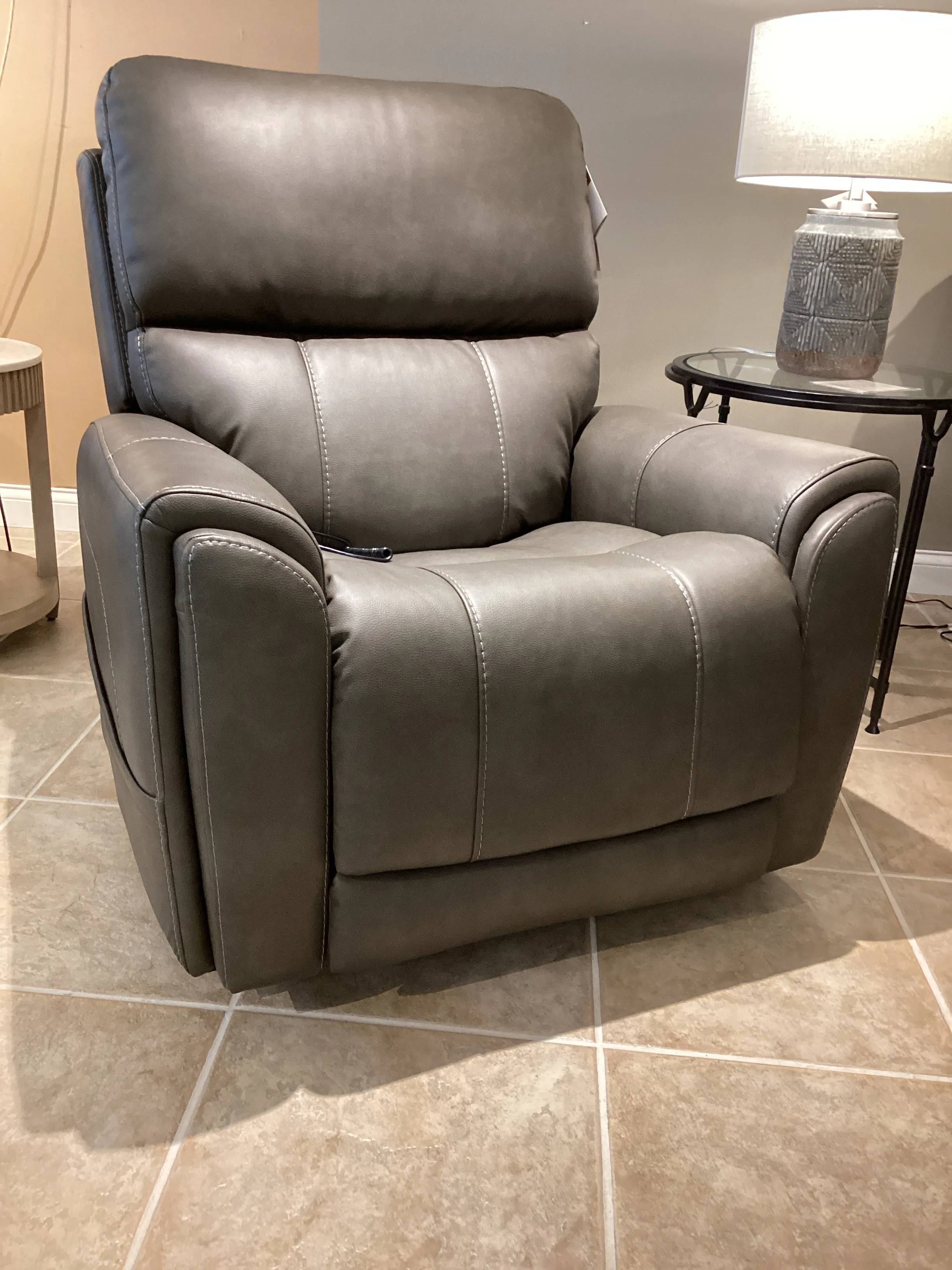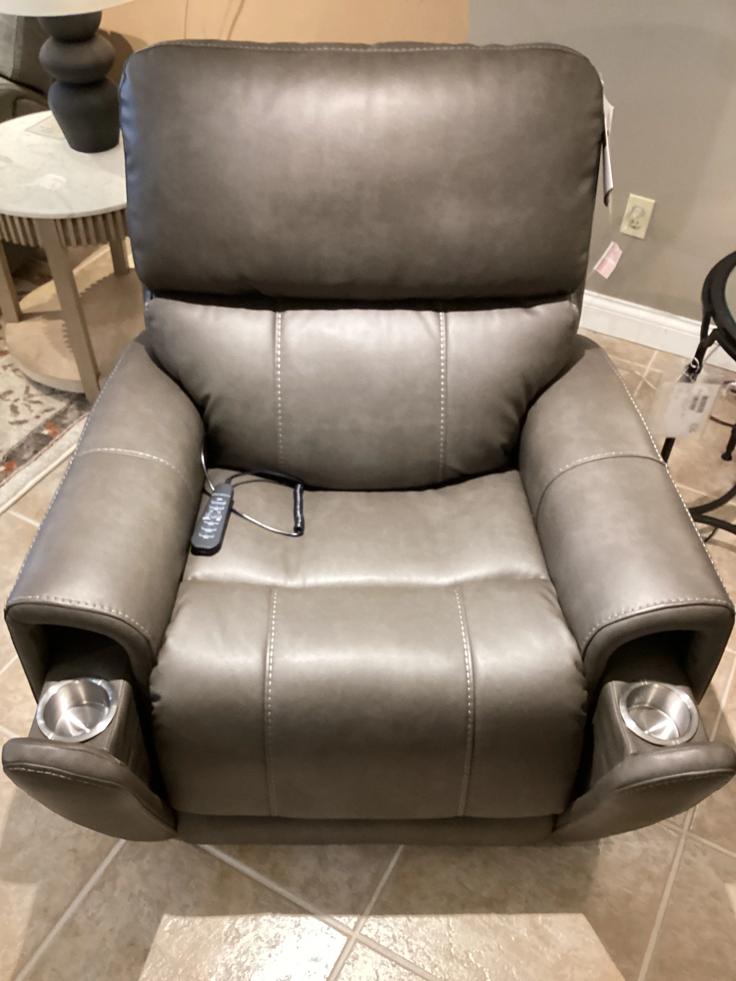 Power up and enjoy secretive perks with the Carter power recliner. This piece features triple power and our Zero Gravity mechanism, allowing you to customize the recline, headrest and lumbar support on both seats, including reclining to a zero-gravity position for the ultimate comfort experience. This recliner will be a statement in your home with its genuine leather look that is a durable, easy to clean fabric in two color choices. Flared arms, a contoured seat and heavy thread stitching details give it a sleek, yet striking look. And it all comes with pop-out cupholders in the arms for discreet storage.