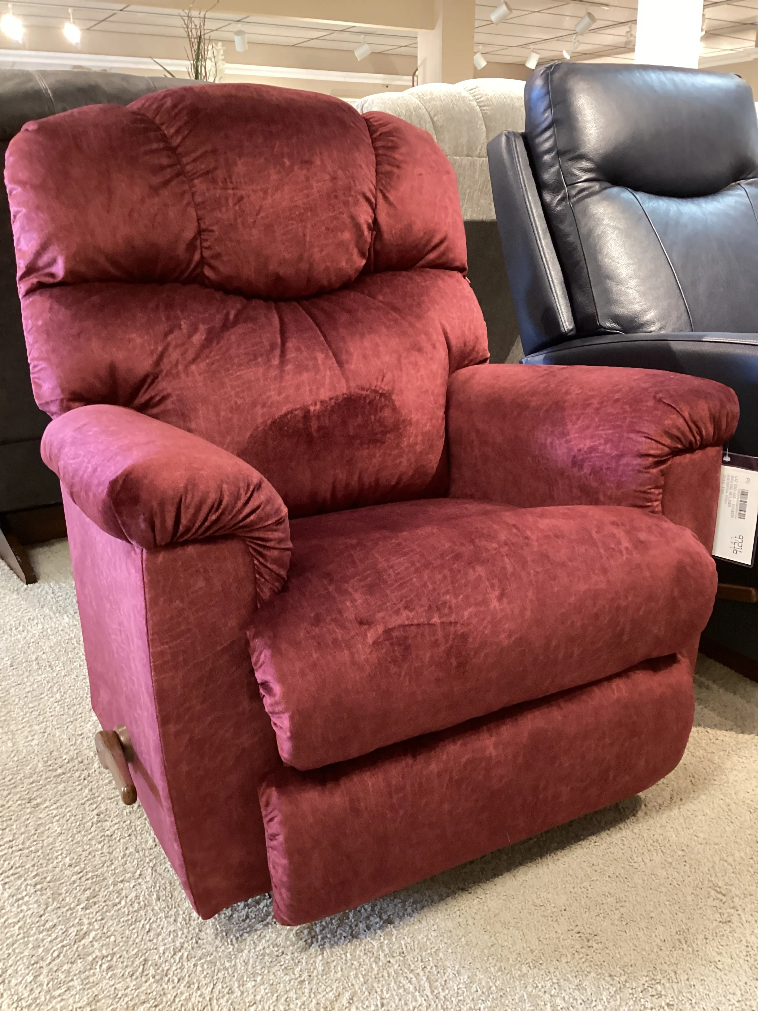 With its pillow top arms and tall, curved back featuring detailed channel-stitching, our Lancer Rocking Recliner delivers a large dose of casual style. Simply use the convenient handle on the outside arm to raise the legrest for reading, relaxing or watching TV. When you're not reclining, it's a relaxing rocker with a smooth, graceful motion. Make it yours with your choice of fabrics and other available upgrades.