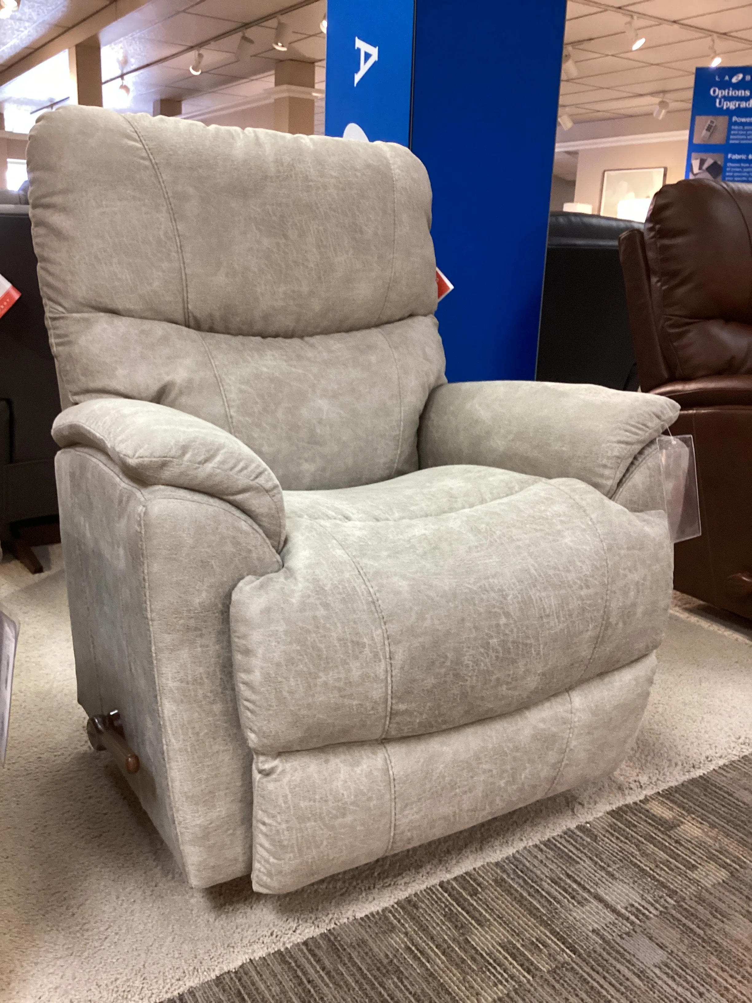 An updated silhouette, complete with slightly flared arms and a sleek tall back give Trouper a look that's fresh. It's also one comfortable rocking recliner. A sculpted bucket seat cradles you in softness while providing extra head and lumbar support. A convenient handle allows you to smoothly and easily adjust the legrest to your preferred position, or rock away the stress of the day. When it comes to comfort, Trouper always comes through.