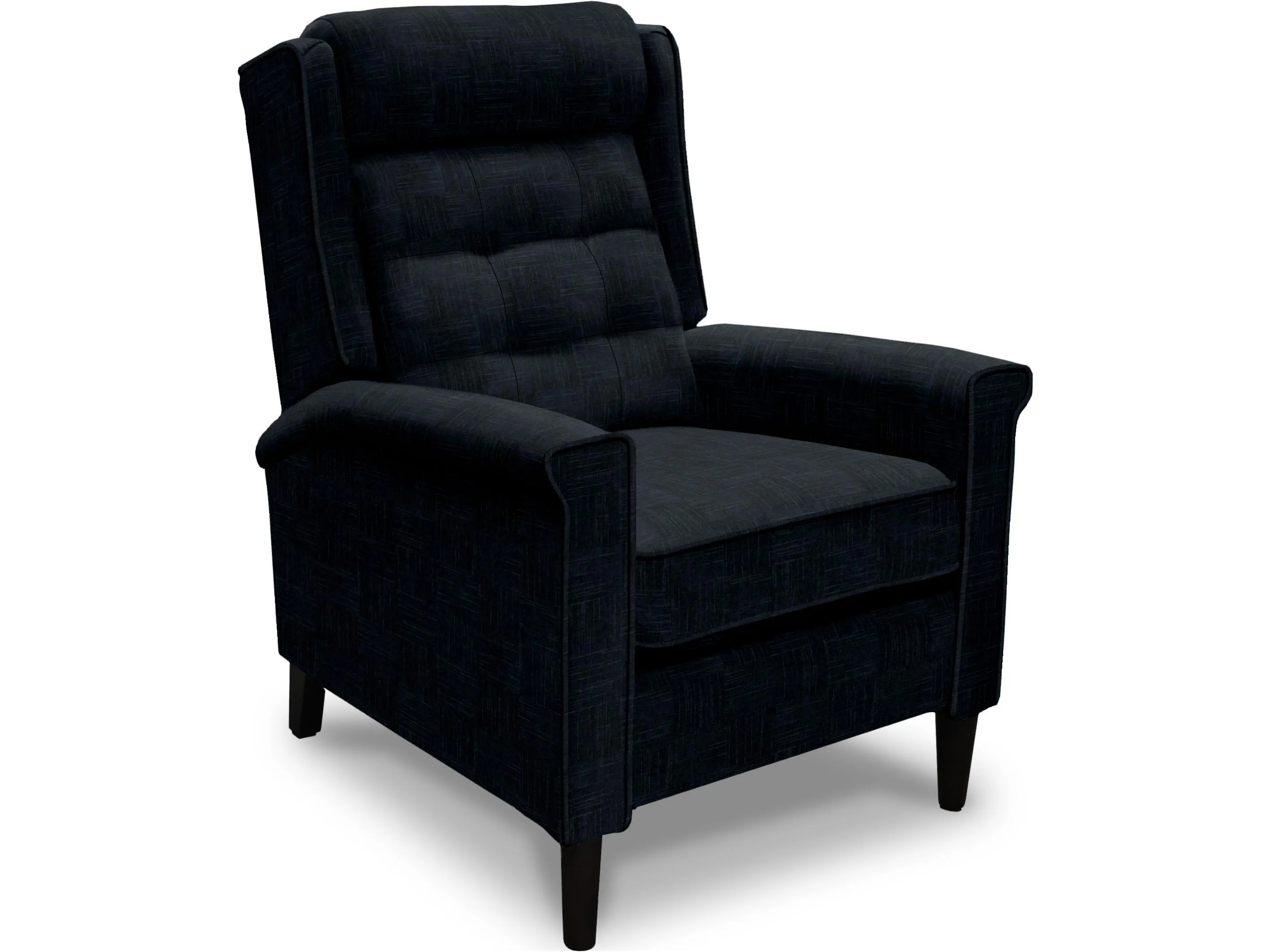 The Holland chair boasts an understated vintage style. This push back recliner features a key arm, cone shaped leg, and chic tufted back. Available in both fabric and leather.