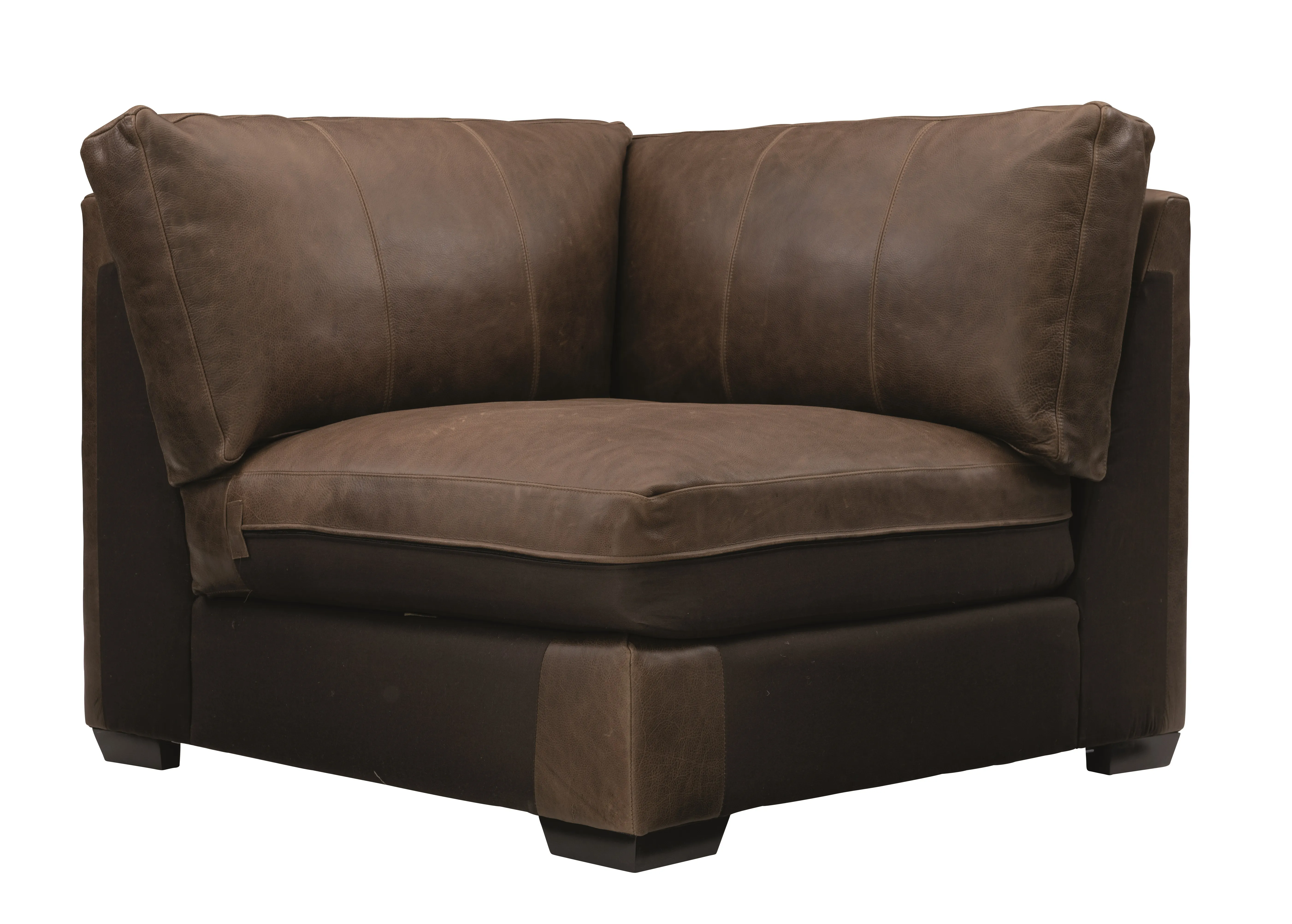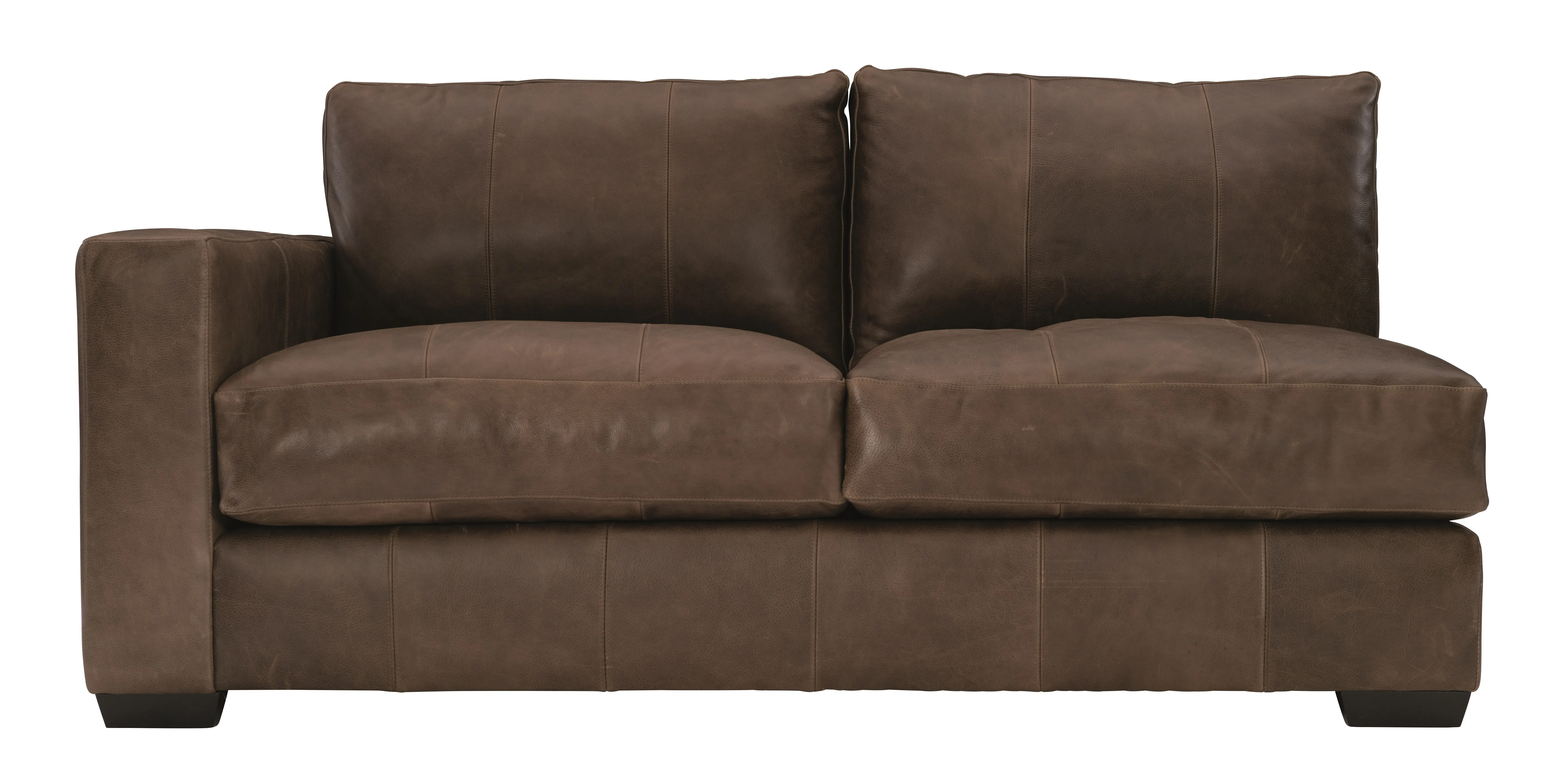 Dressed in luxurious top-grain leather, the Dawkins sofa offers casual comfort with a high-end look. The timeless modern design features wide track arms and tapered block feet, available in a variety of wood finishes. Plush cushions and fiber back pillows make this sophisticated sofa the perfect place to lounge in style.