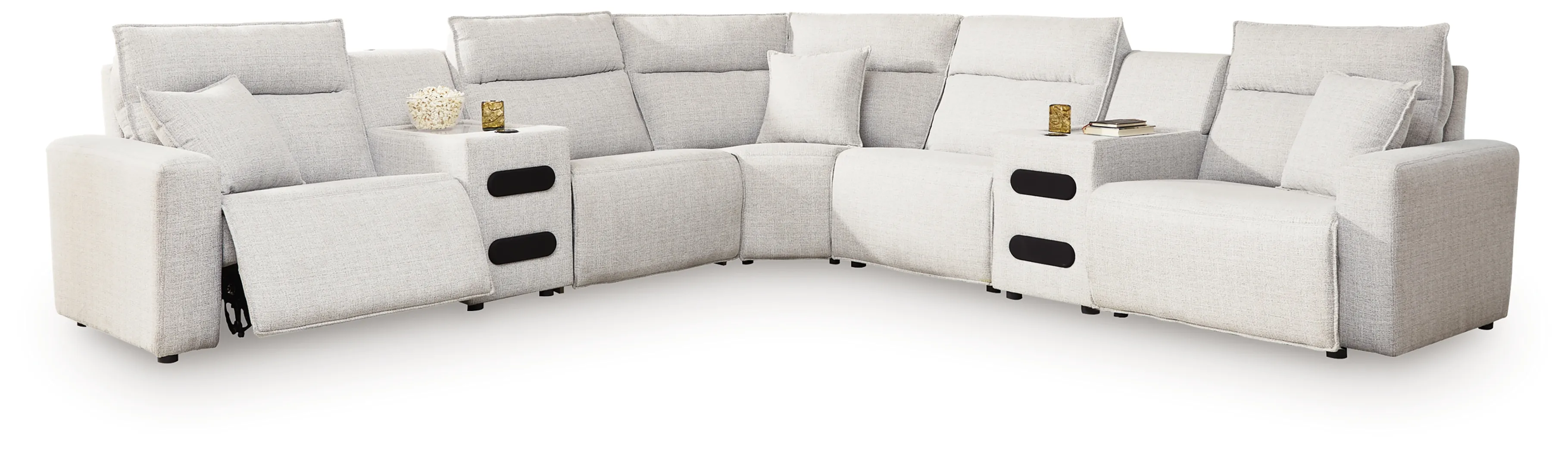 Includes 7 modular pieces: left-arm facing power recliner, power armless recliner, armless chair, wedge, 2 consoles with audio systems and right-arm facing power recliner