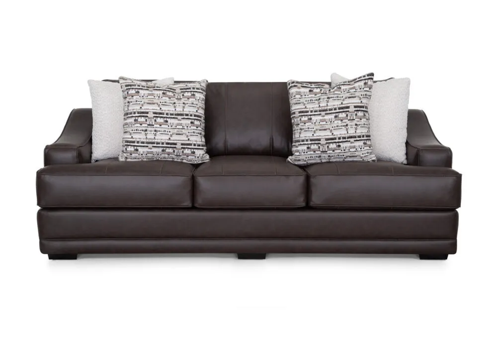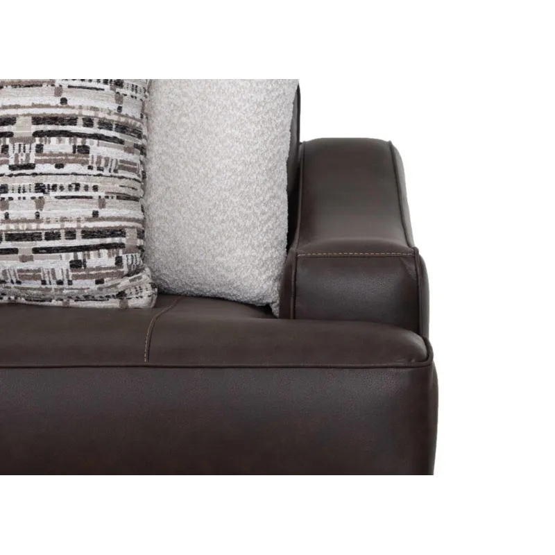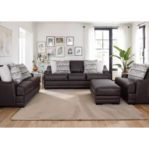 The 893 Prescott Collection is designed to make a bold statement of comfort and style in your living space. This large-scale sofa group includes a sofa, loveseat, chair and a half, and matching ottoman. All pieces are crafted from premium chocolate fabric that emulates the inviting look of leather, combining sophisticated charm with a soft, luxurious feel. Coordinating throw pillows are included, adding a touch of texture and visual dimension. With its deep cushions and overstuffed backs, the Prescott Collection invites you to sink in and unwind. The padded inset slope arms with elegant, mini piecrust welting add a touch of timeless sophistication, while the solid wooden legs provide sturdy support and a refined finish.