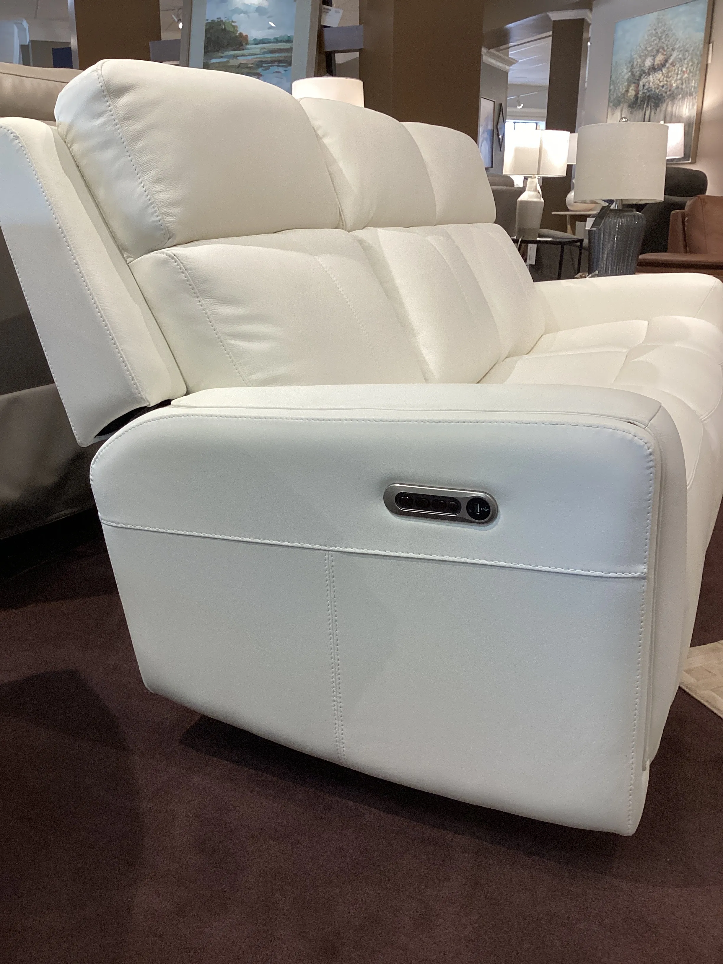 Bring your living room to the next level with the sleek, innovative Alister power gliding sofa. This transitional style sports sleek curves upholstered in your choice of luxurious top-grain leather. A step above typical reclining, these gliding seats provide a smooth, versatile, and unique experience. The ultimate in futuristic comfort, this sofa includes a drop down back cushion with two cupholders, a wireless charging pad, and USB ports to keep your devices charged and within reach. Kick back in the Alister, the future of relaxation.