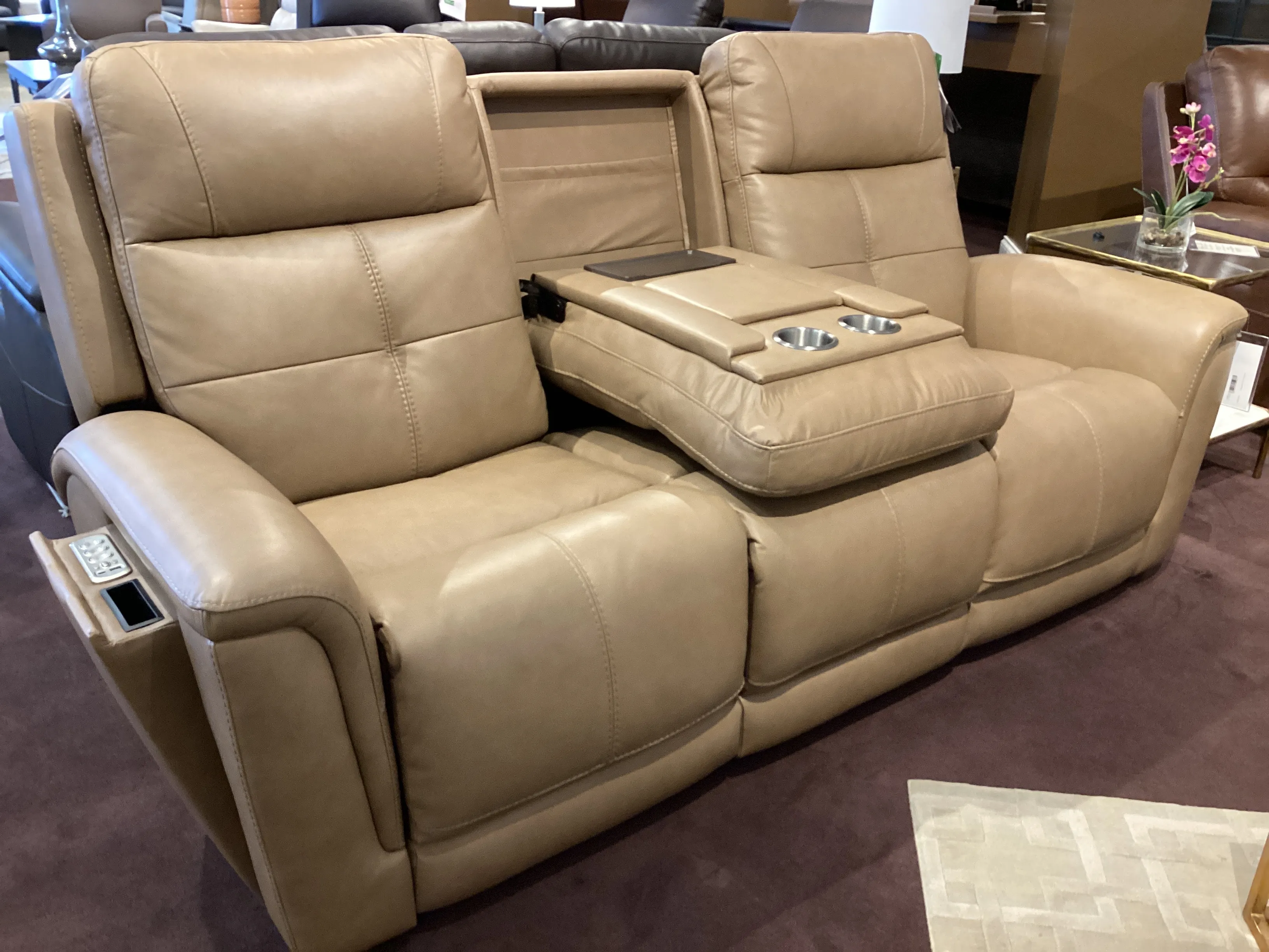 Transitional style with padded arms, pop-out power switch and phone compartment