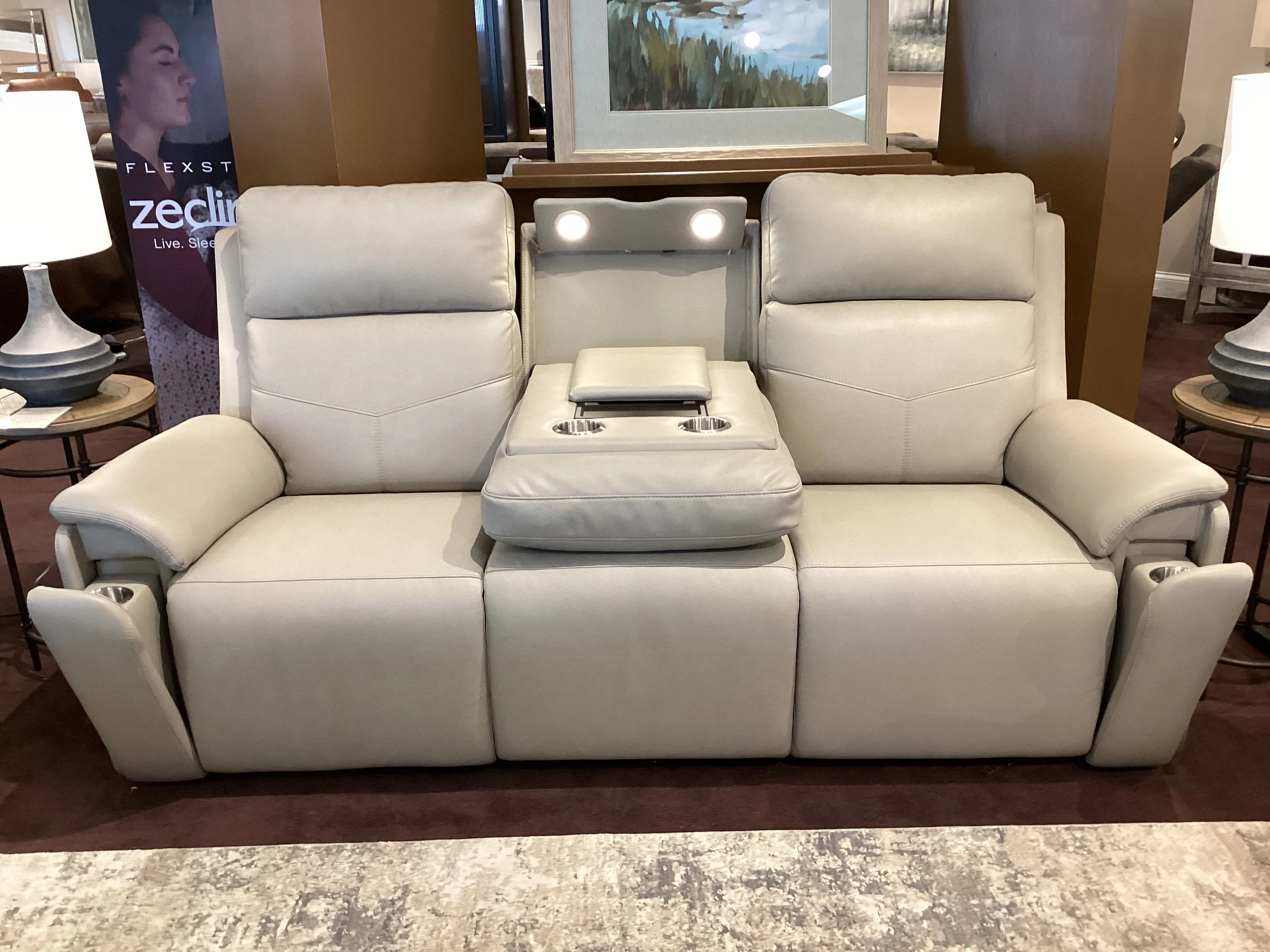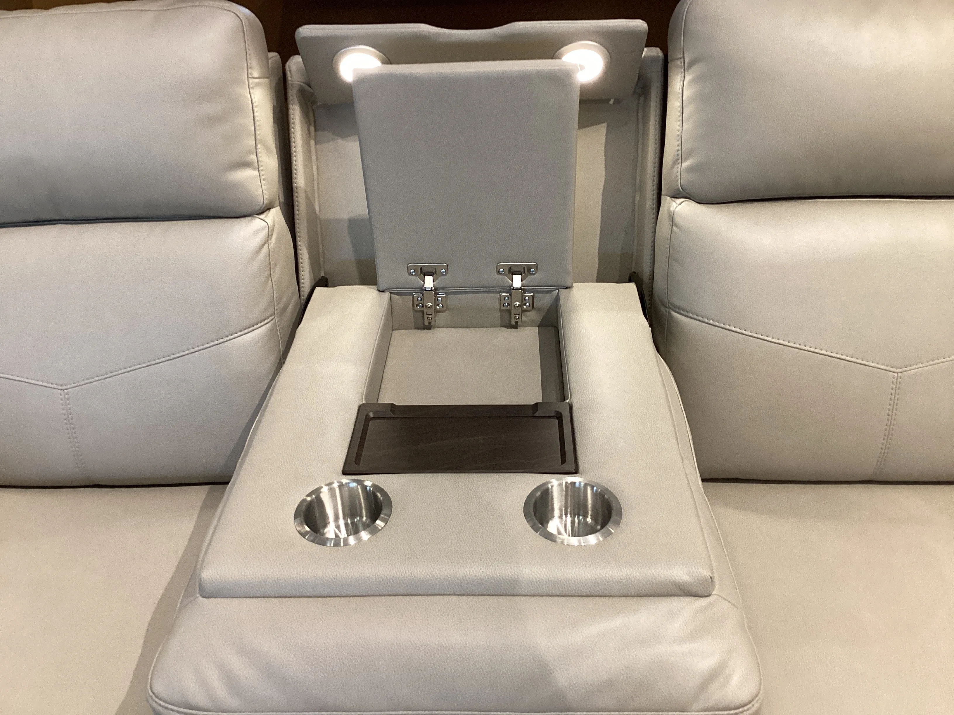 Center, drop-down back cushion contains a storage compartment with USB-A and USB-C charging ports, wireless charging tray, two cupholders and touch-lighting