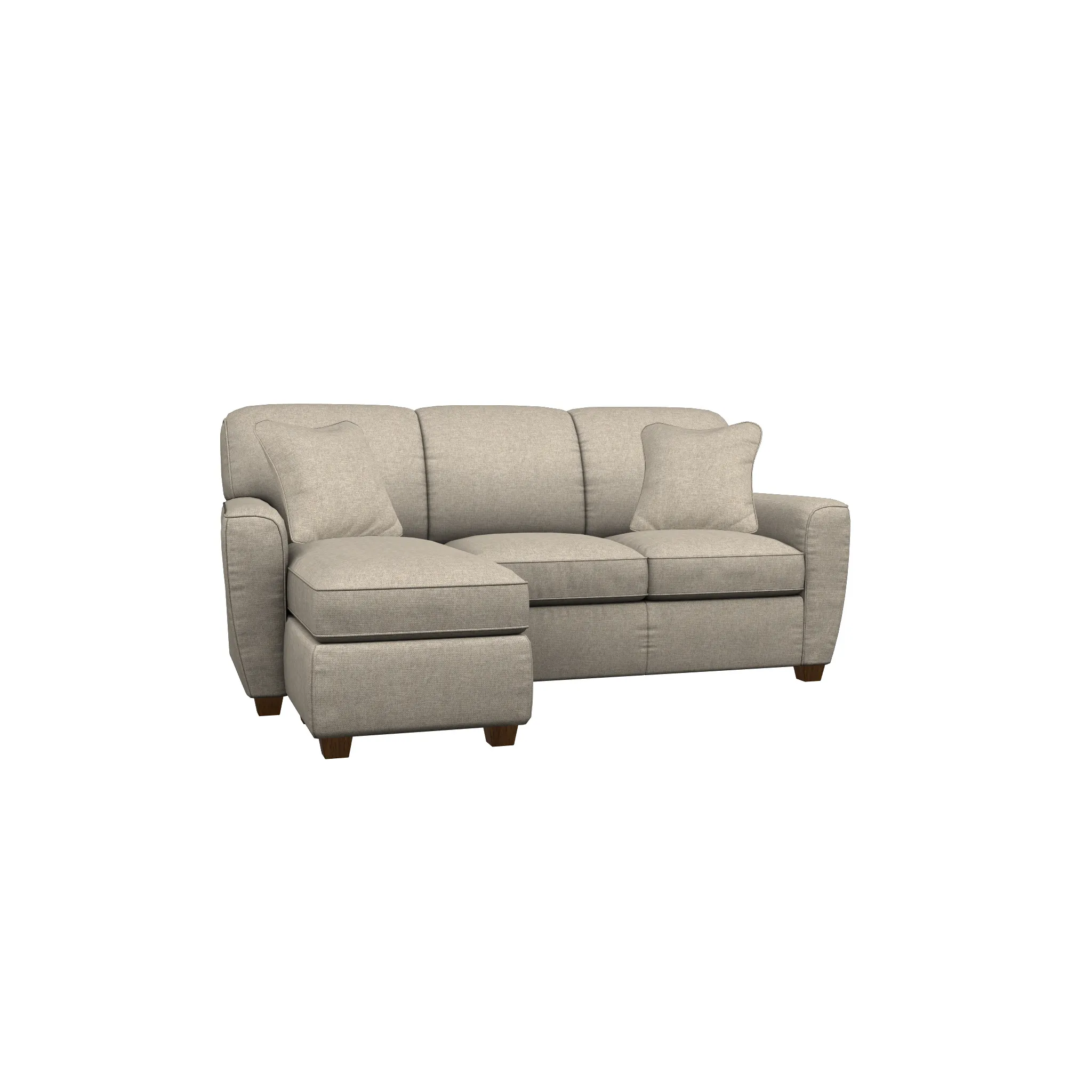 Piper's sleek, smooth, streamlined style fits in with just about any decor from ultra-modern to comfortably casual. Simple, smooth Premier standard seats offer long-lasting comfort and support while the sleek, modern arms and decorative wood legs to bring just of an upscale vibe. The unique addition of the chaise offers even more space to relax, with the versatility to place the chaise cushion and ottoman on the left or right. Make it yours with your choice of fabrics and available upgrades. Includes two 20" knife-edge accent pillows with welt trim.