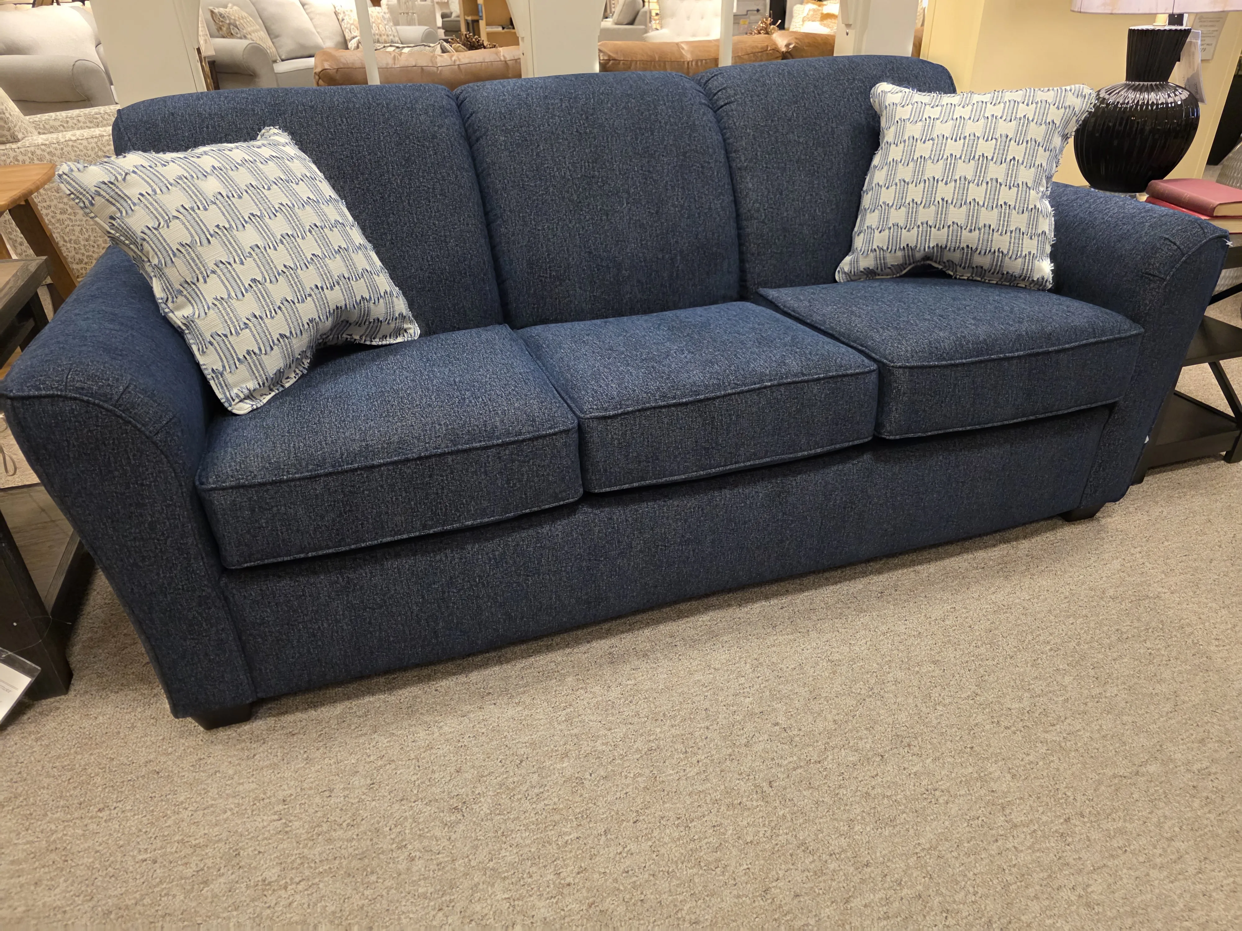 Our Smyrna collection features a contemporary sofa, loveseat, chair, and ottoman, as well as queen, full, and twin sleepers. The sofa boasts a three over three configuration with a channel stitched back over bordered seat cushions and a clean front rail. The modified half-moon arms are slightly flared. The sleeper is available with a standard, Visco, or air mattress.