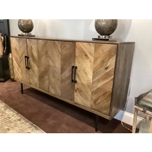 Wowing with exquisite quatrefoil framing, made all the more dramatic with the contrast of clear glass, this 4-door cabinet serves up an easy-elegant aesthetic sure to satisfy. The light and lovely finish brings a relaxed sensibility to the scene.