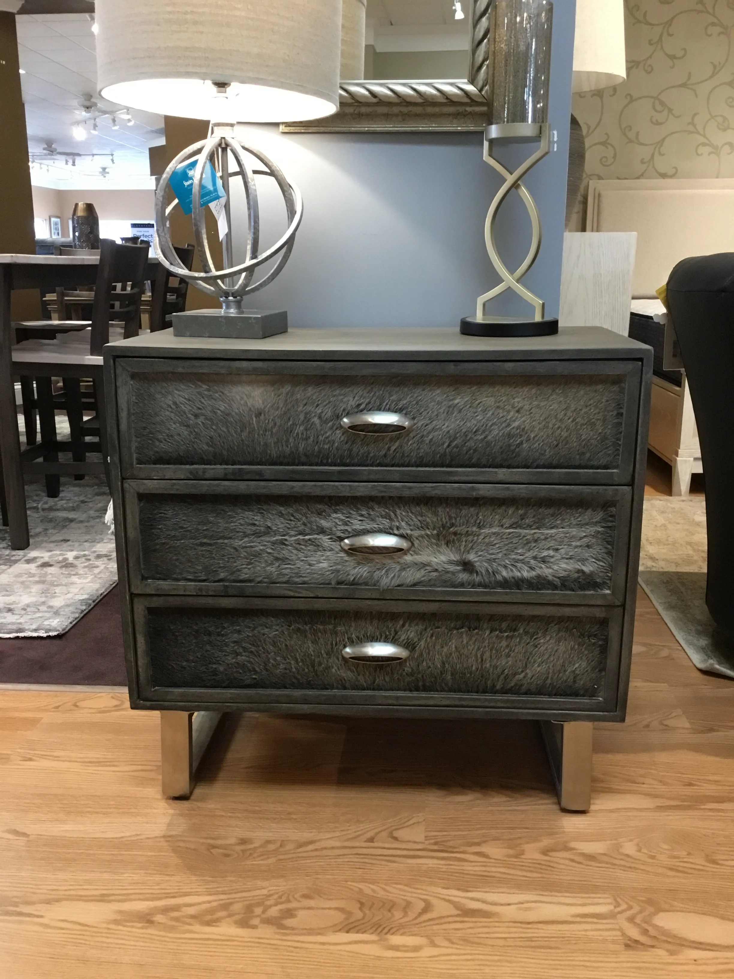 The Crestview Collection Theodore 3-drawer Gray Cowhide Chest is a beautiful chest sitting atop sleigh legs. This chest has three drawers each covered with gray cowhide on the front. The wooden construction has a gray finish and is accented by the metal drawer pulls. This chest works perfectly as an accent piece in your living room or hallway or even as a nightstand in your bedroom.