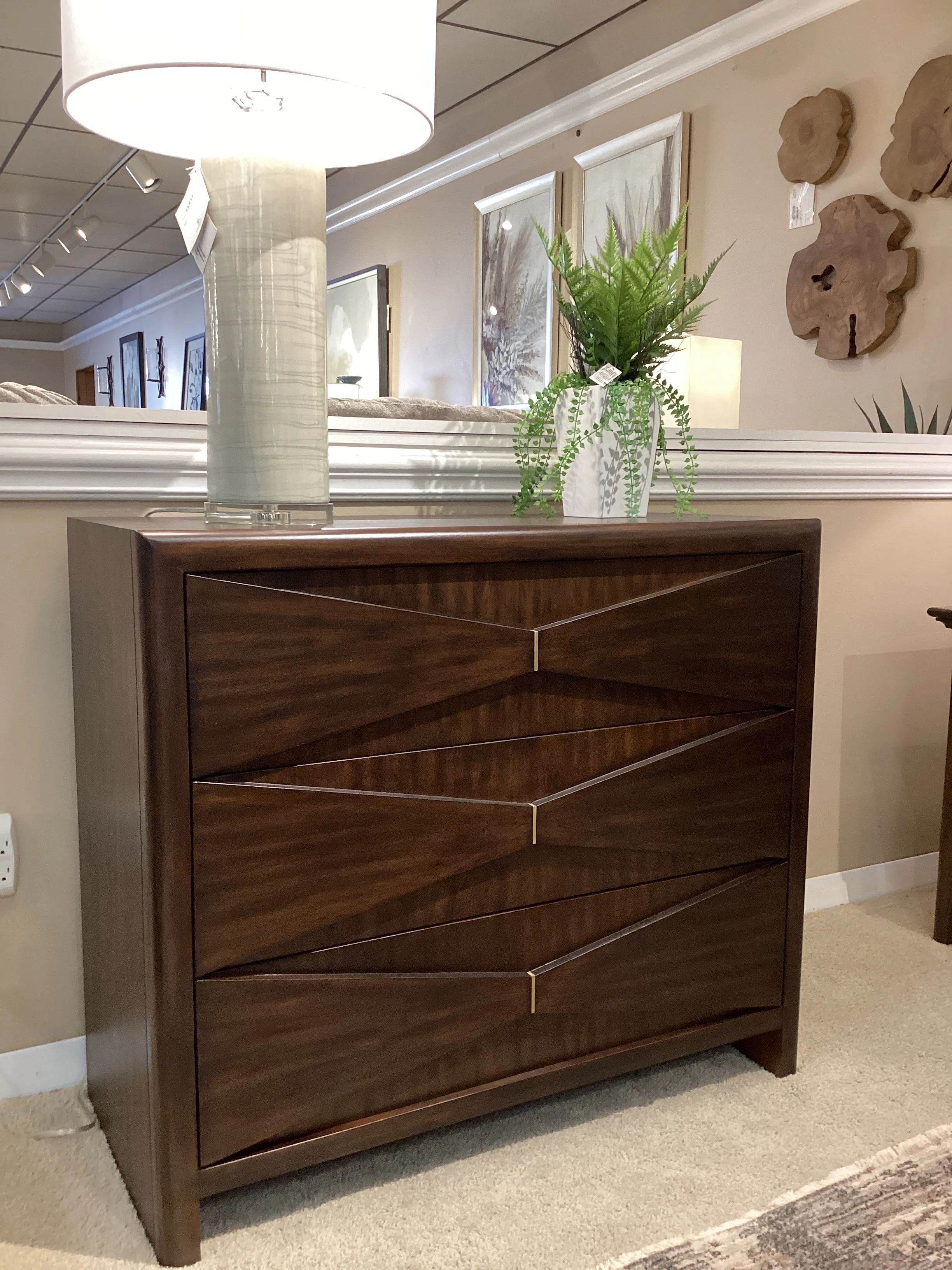 The Bowtie Chest Is A Stylish Piece Crafted From Acacia Wood And Veneer In A Deep Whisky Finish. It Features A Distinctive Bow-tie Design On The Drawer Fronts And Is Met With A Simple Plated Brass Detail In The Middle. With Clean Lines And A Minimalist Aesthetic, This Chest Is A Perfect Addition To Modern And Mid-century Inspired Interiors.