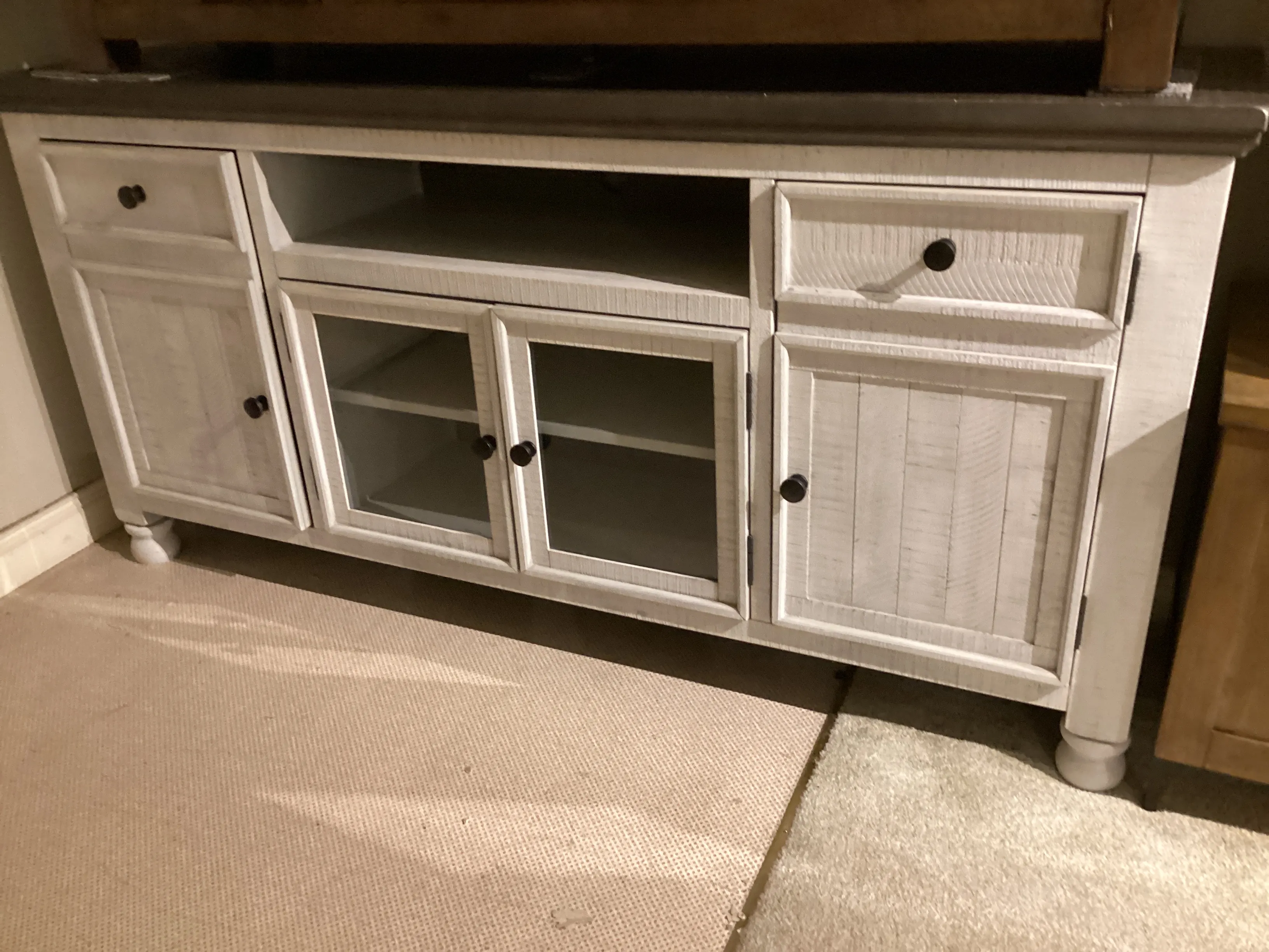 Have your fill of modern farmhouse style with this TV stand. Its distressed two-tone finish pairs a vintage white with a weathered gray for a look that’s utterly charming. Right and left cabinets open to reveal adjustable shelving for all your entertainment center storage needs. Center glass doors add to its relaxed appeal.