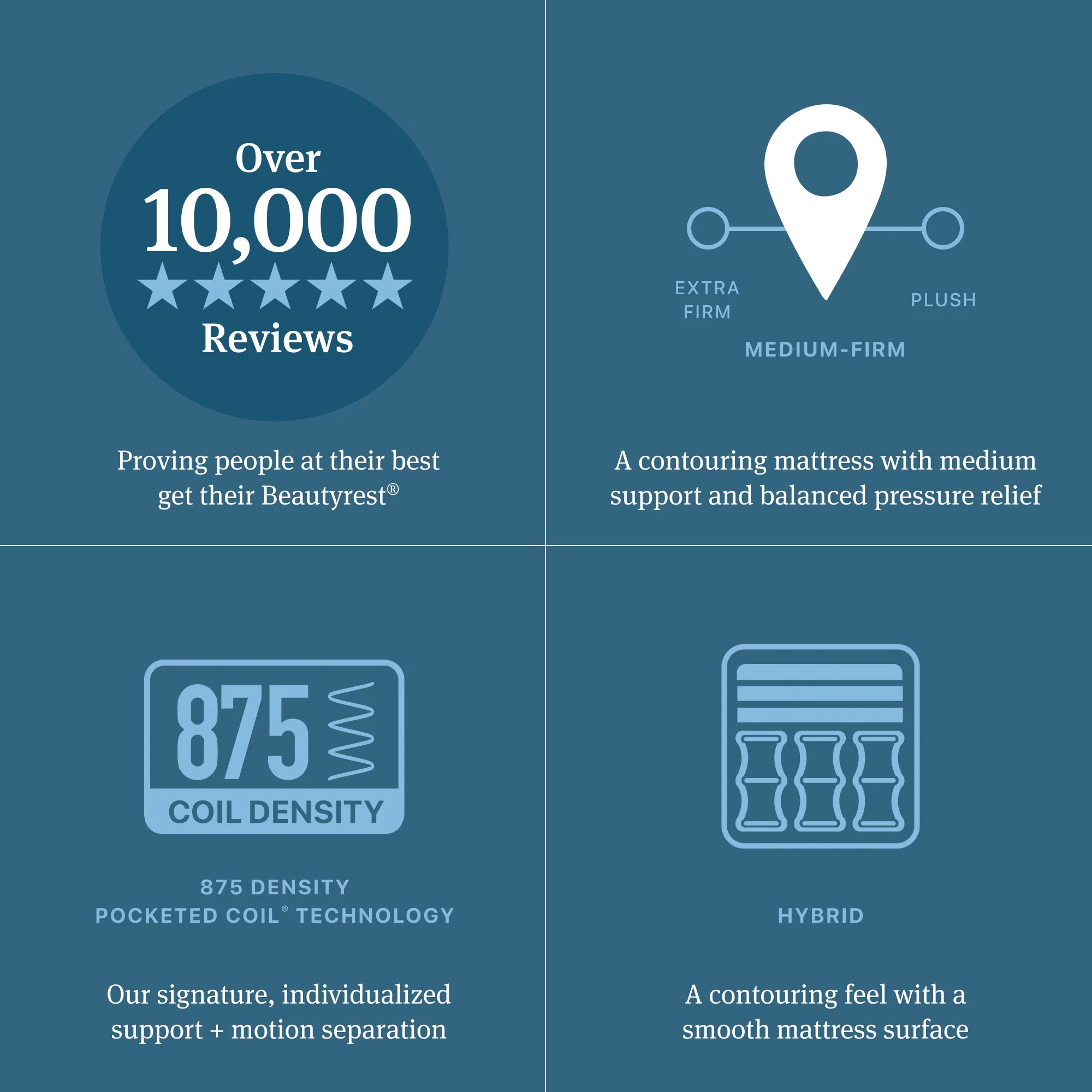 There's sleep, and then there's Beautyrest®. With the new Beautyrest® mattress collection, 875-density Pocketed Coil® Technology provides our signature individualized support + motion separation. Sleep comfortably with a cooling sleep surface provided by InfiniCool® Technology. Our Hybrid construction features Beautyrest ActiveResponse™ MAX Memory Foam right at the surface. With 100 years of innovation behind us and many, many more ahead, our latest collection shows exactly how people at their best, get their Beautyrest®.
