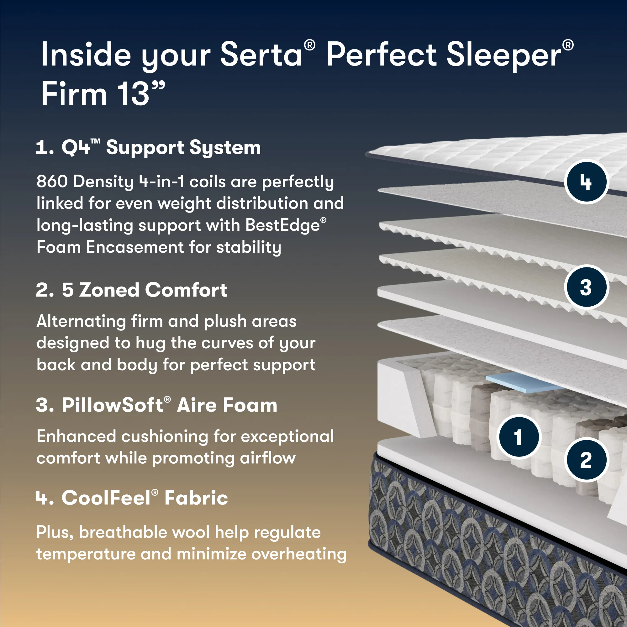 Serta® Perfect Sleeper® Firm 13” delivers perfect sleep, night after night. Featuring our Q4™ Support System, 860 density 4-in-1 coils that are perfectly linked for even weight distribution and long-lasting support with BestEdge™ Foam Encasement for stability. Our unique 5 Zoned Comfort features alternating firm and plush areas and is designed to hug the curves of your back and body for perfect support. PillowSoft® Aire HD Foam offers enhanced cushioning for exceptional comfort while promoting airflow. A layer of Serta® Support Foam helps provide the ideal balance of cushioning and support for refreshing sleep. Stay cool and comfortable with breathable wool, plus CoolFeel® Fabric engineered with cooling performance technologies. The Serta® Perfect Sleeper® with Q4™ Support System helps relieve aches and back pain with consistent comfort, reduced pressure, and long-lasting support at a great value—for perfect sleep, night after night.