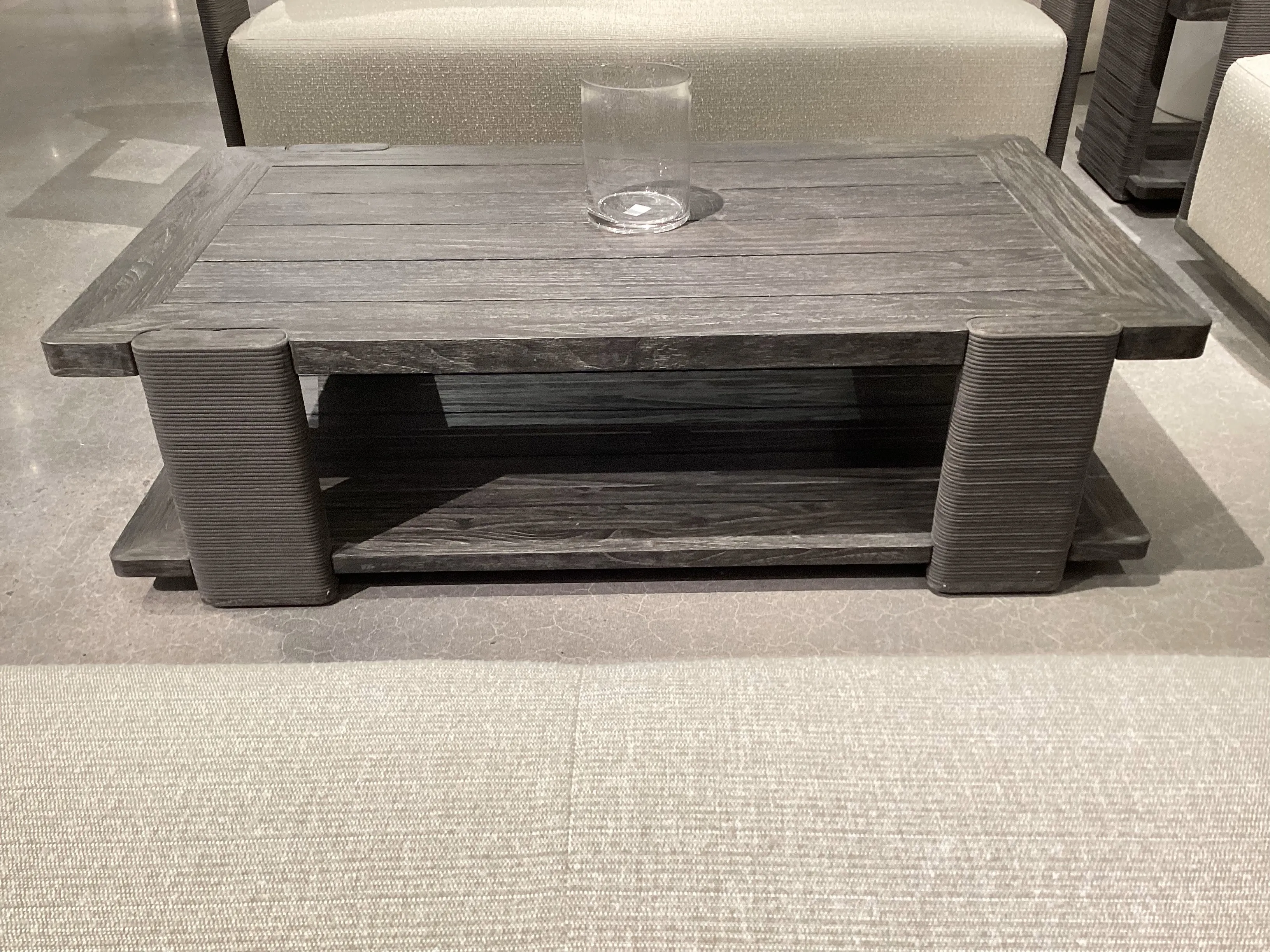 - Teak in Smoked Truffle finish with rope-wrapped legs in Oxford Brown finish